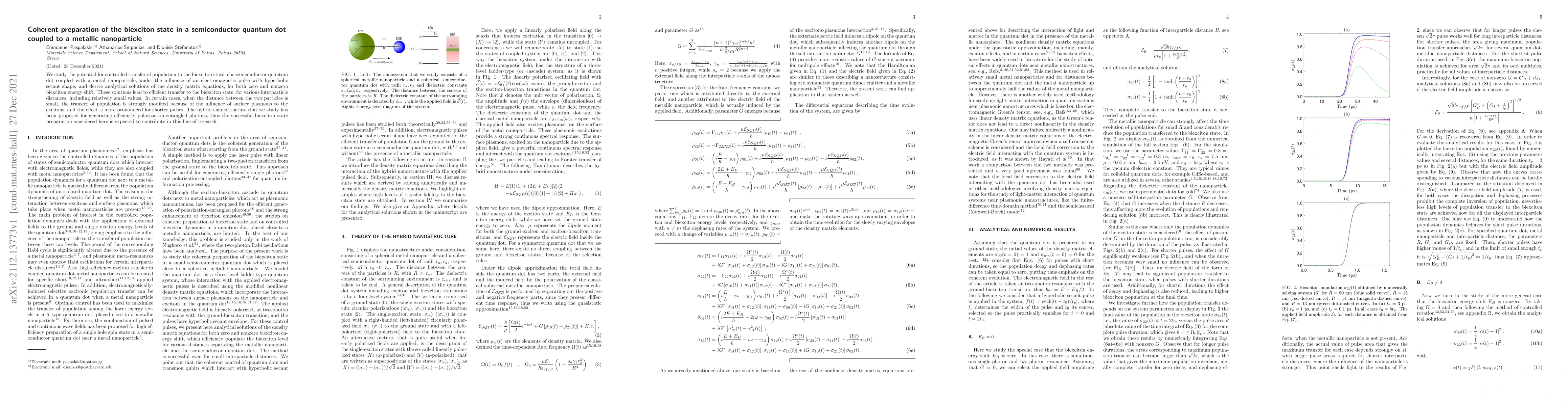 We study the potential for controlled transfer of population to the biexciton state of a semiconductor quantum dot coupled with a metal nanoparticle, under the influence of an electromagnetic pulse with hyperbolic secant shape, and derive analytical solutions of the density matrix equations, for both zero and nonzero biexciton energy shift. These solutions lead to efficient transfer to the biexciton state, for various interparticle distances, including relatively small values. In certain cases, when the distance between the two particles is small, the transfer of population is strongly modified because of the influence of surface plasmons to the excitons, and the effect is more pronounced for shorter pulses. The hybrid snanostructure that we study has been proposed for generating efficiently polarization-entangled photons, thus the successful biexciton state preparation considered here is expected to contribute in this line of research.