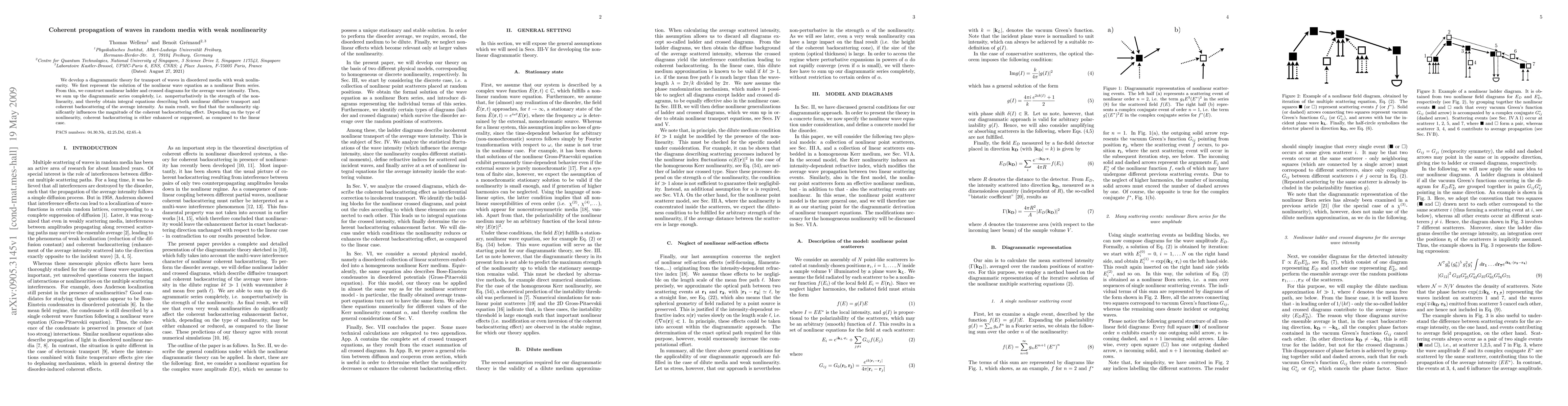 This research develops a diagrammatic theory for wave transport in weakly nonlinear disordered media, showing that nonlinearity alters coherent backscattering. It derives integral equations describing nonlinear diffusive transport and reveals that the nonlinearity can either enhance or suppress coherent backscattering compared to linear cases.