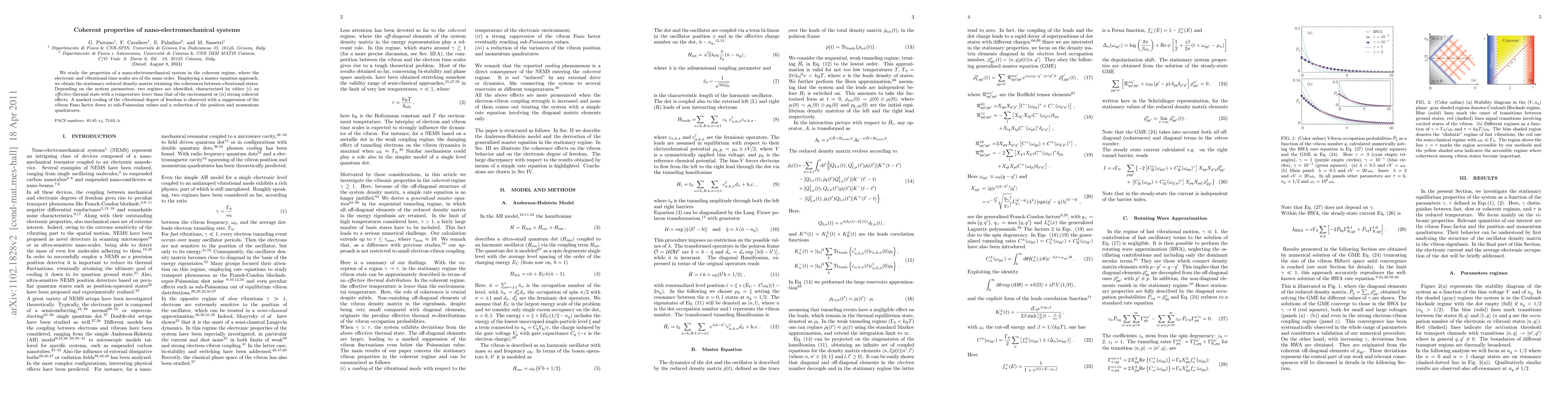 We study the properties of a nano-electromechanical system in the coherent regime, where the electronic and vibrational time scales are of the same order. Employing a master equation approach, we obtain the stationary reduced density matrix retaining the coherences between vibrational states. Depending on the system parameters, two regimes are identified, characterized by either ($i$) an {\em effective} thermal state with a temperature {\em lower} than that of the environment or ($ii$) strong coherent effects. A marked cooling of the vibrational degree of freedom is observed with a suppression of the vibron Fano factor down to sub-Poissonian values and a reduction of the position and momentum quadratures.