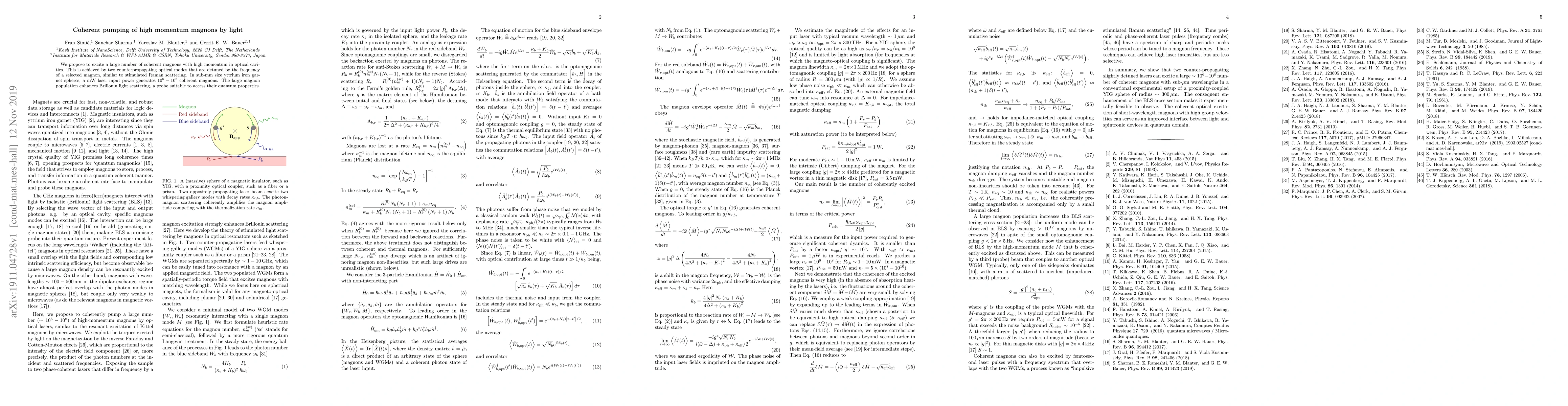 We propose to excite a large number of coherent magnons with high momentum in optical cavities. This is achieved by two counterpropagating optical modes that are detuned by the frequency of a selected magnon, similar to stimulated Raman scattering. In sub-mm size yttrium iron garnet spheres, a mW laser input power generates 10^6-10^8 coherent magnons. The large magnon population enhances Brillouin light scattering, a probe suitable to access their quantum properties.