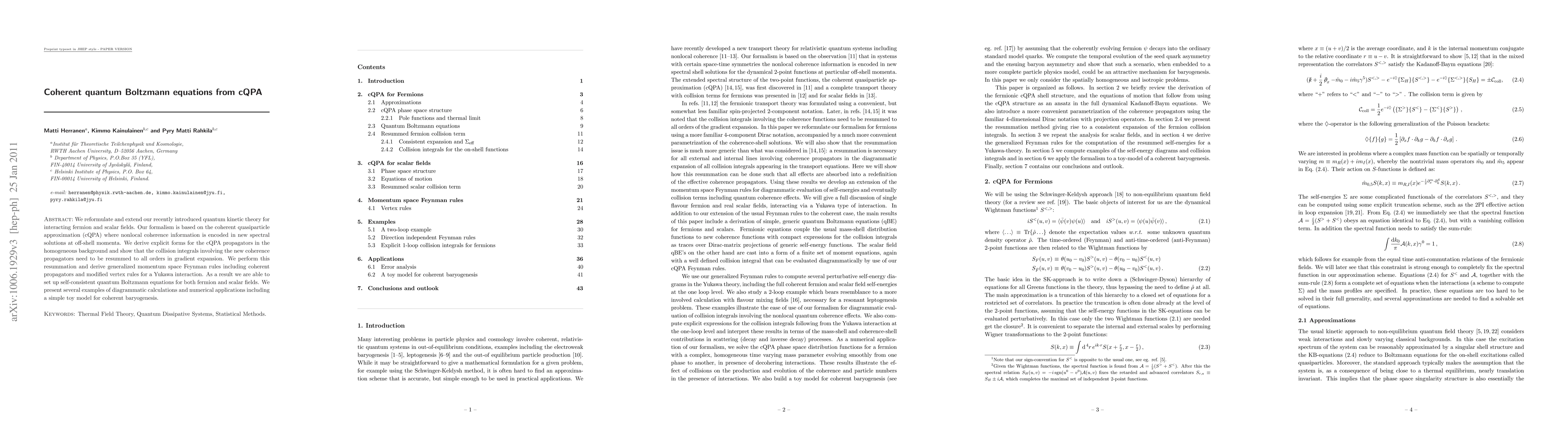 We reformulate and extend our recently introduced quantum kinetic theory for interacting fermion and scalar fields. Our formalism is based on the coherent quasiparticle approximation (cQPA) where nonlocal coherence information is encoded in new spectral solutions at off-shell momenta. We derive explicit forms for the cQPA propagators in the homogeneous background and show that the collision integrals involving the new coherence propagators need to be resummed to all orders in gradient expansion. We perform this resummation and derive generalized momentum space Feynman rules including coherent propagators and modified vertex rules for a Yukawa interaction. As a result we are able to set up self-consistent quantum Boltzmann equations for both fermion and scalar fields. We present several examples of diagrammatic calculations and numerical applications including a simple toy model for coherent baryogenesis.