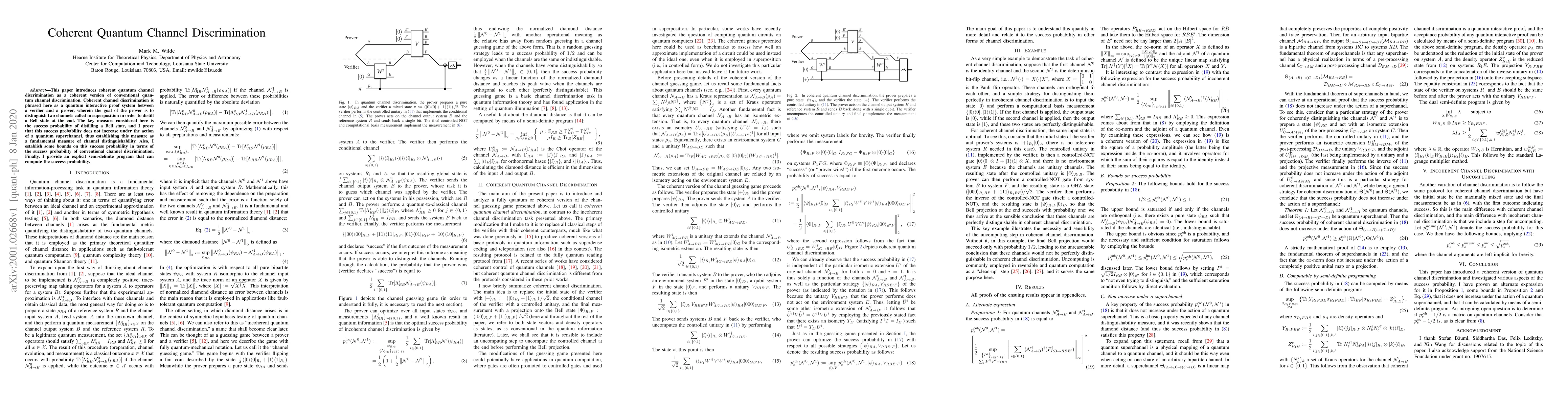 This paper explores coherent quantum channel discrimination, presenting it as a quantum interactive proof system where a prover aims to distinguish two superimposed channels to distill a Bell state. It establishes that the success probability for this task remains unchanged under quantum superchannel actions, and provides bounds and a semi-definite program for computing this probability.
