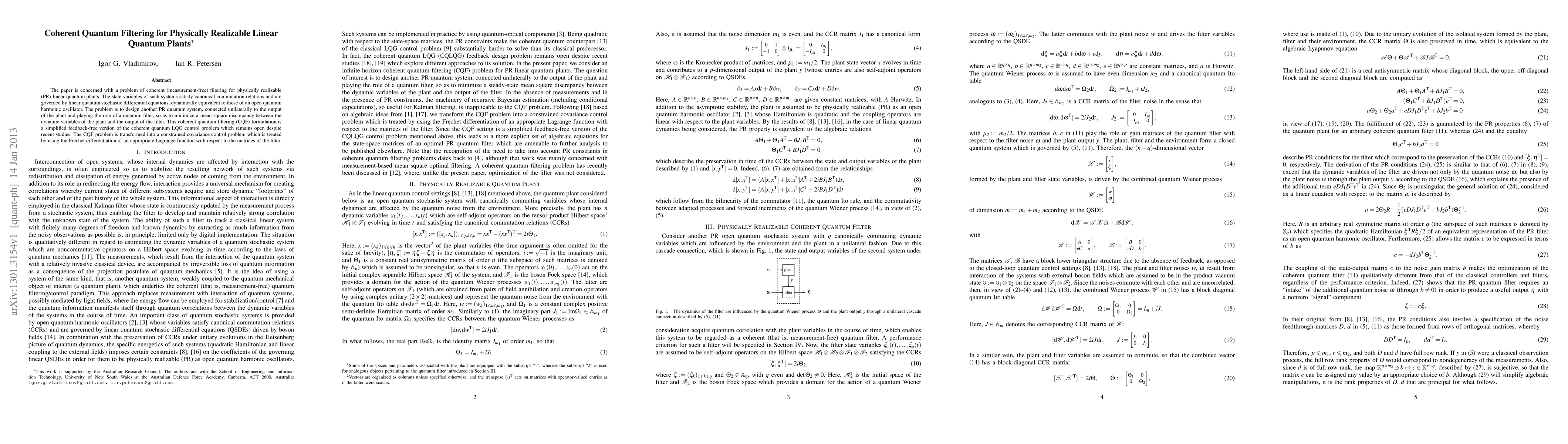 The paper is concerned with a problem of coherent (measurement-free) filtering for physically realizable (PR) linear quantum plants. The state variables of such systems satisfy canonical commutation relations and are governed by linear quantum stochastic differential equations, dynamically equivalent to those of an open quantum harmonic oscillator. The problem is to design another PR quantum system, connected unilaterally to the output of the plant and playing the role of a quantum filter, so as to minimize a mean square discrepancy between the dynamic variables of the plant and the output of the filter. This coherent quantum filtering (CQF) formulation is a simplified feedback-free version of the coherent quantum LQG control problem which remains open despite recent studies. The CQF problem is transformed into a constrained covariance control problem which is treated by using the Frechet differentiation of an appropriate Lagrange function with respect to the matrices of the filter.