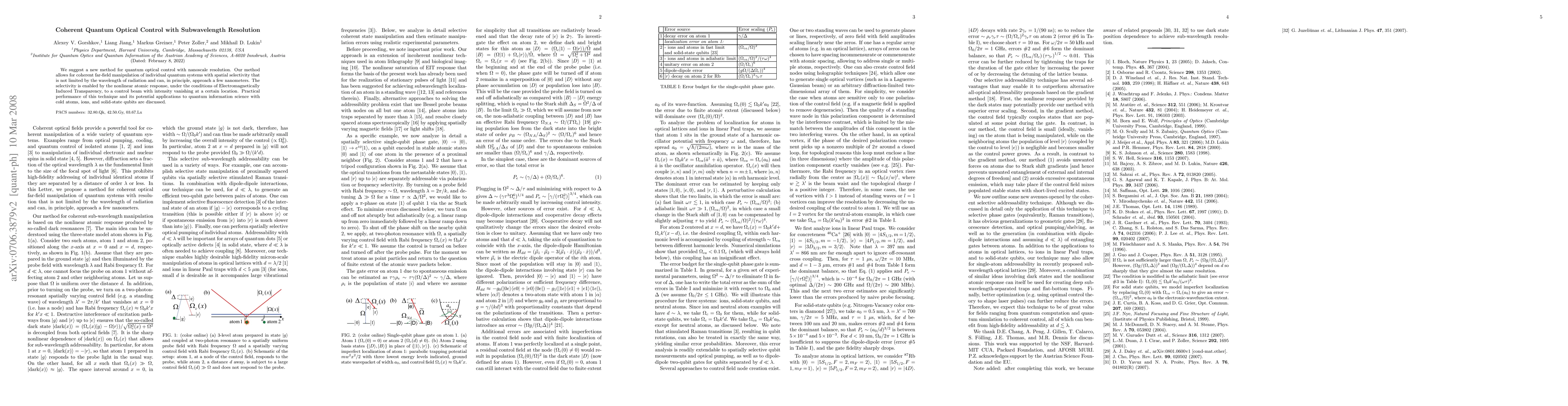 We suggest a new method for quantum optical control with nanoscale resolution. Our method allows for coherent far-field manipulation of individual quantum systems with spatial selectivity that is not limited by the wavelength of radiation and can, in principle, approach a few nanometers. The selectivity is enabled by the nonlinear atomic response, under the conditions of Electromagnetically Induced Transparency, to a control beam with intensity vanishing at a certain location. Practical performance of this technique and its potential applications to quantum information science with cold atoms, ions, and solid-state qubits are discussed.
