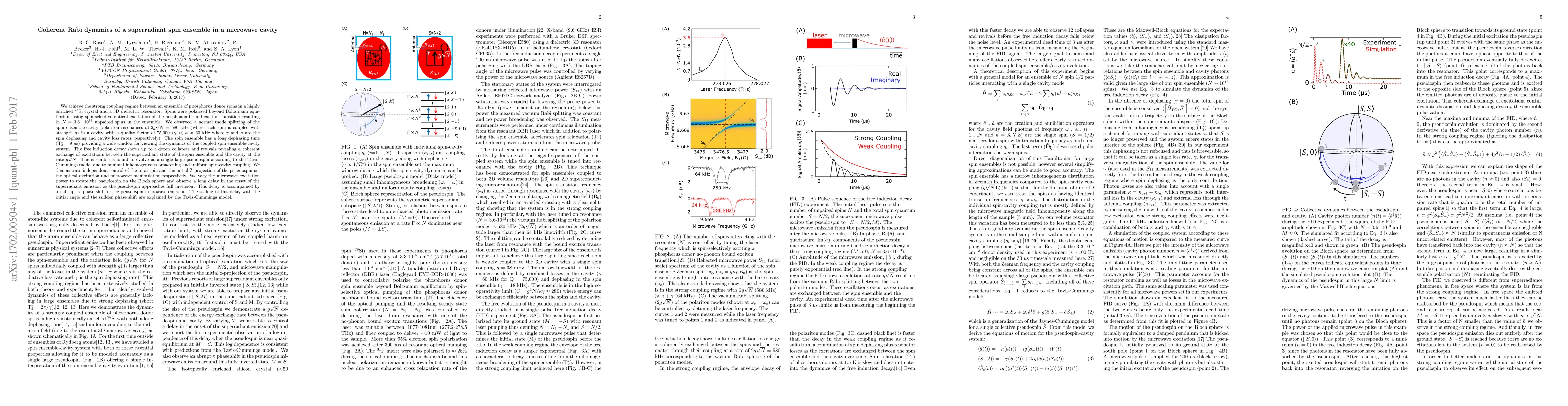 This paper investigates strong coupling between a superradiant spin ensemble in a silicon crystal and a microwave cavity, achieving a coherent Rabi dynamics. The study reveals a normal mode splitting and demonstrates the coherent exchange of excitations between the spin ensemble and the cavity, showcasing the ensemble's behavior as a single large pseudospin and its manipulation via optical and microwave techniques.