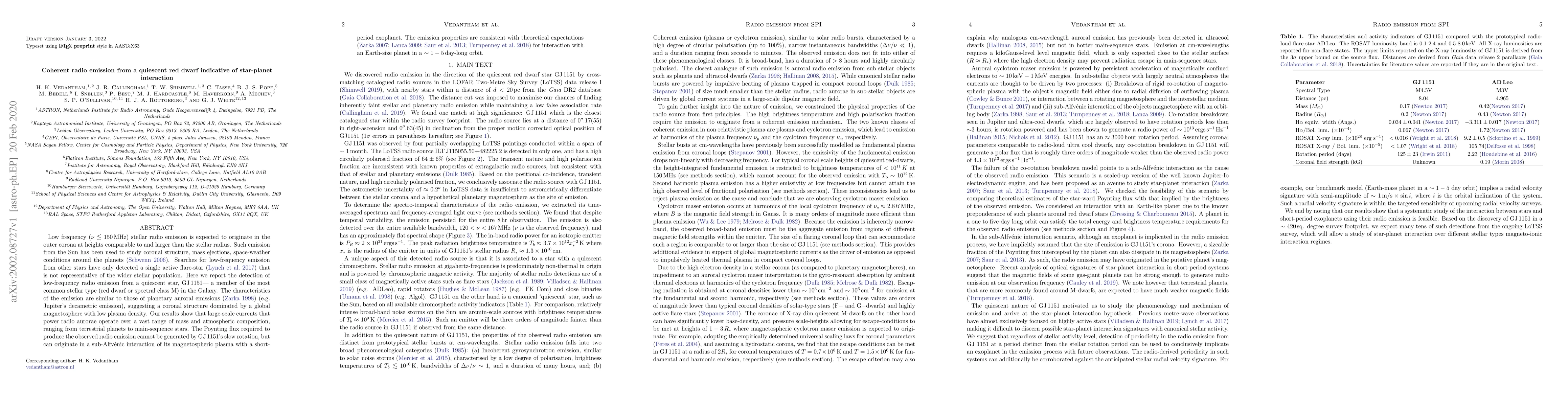 This paper reports the detection of low-frequency radio emission from the quiescent red dwarf GJ 1151, suggesting star-planet interaction. The emission, similar to planetary auroral emissions, implies a global magnetosphere and indicates that such interactions are common across a wide range of stellar and planetary types.