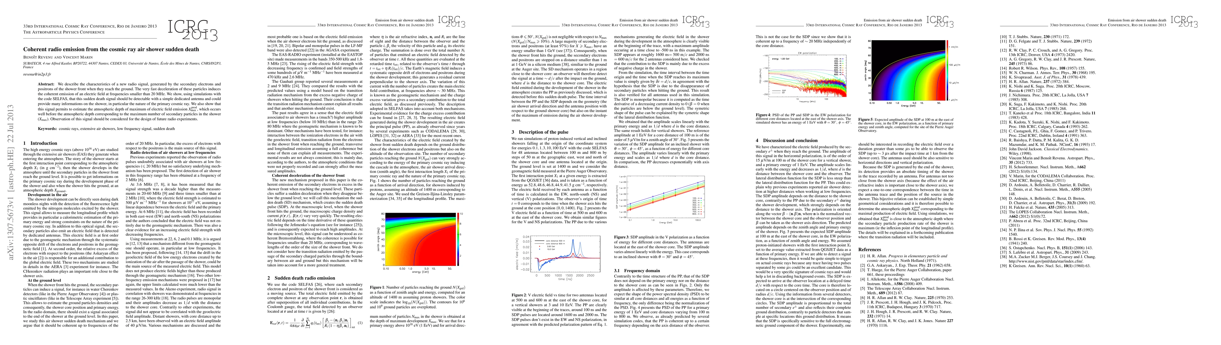 We describe the characteristics of a new radio signal, generated by the secondary electrons and positrons of the shower front when they reach the ground. The very fast deceleration of these particles induces the coherent emission of an electric field at frequencies smaller than 20 MHz. We show, using simulations with the code SELFAS, that this sudden death signal should be detectable with a simple dedicated antenna and could provide many informations on the shower, in particular the nature of the primary cosmic ray. We also show that this signal permits to estimate the atmospheric depth of maximum of electric field emission X_{max}^{prod}, which occurs max well before the atmospheric depth corresponding to the maximum number of secondary particles in the shower (Xmax). Observation of this signal should be considered for the design of future radio experiments.