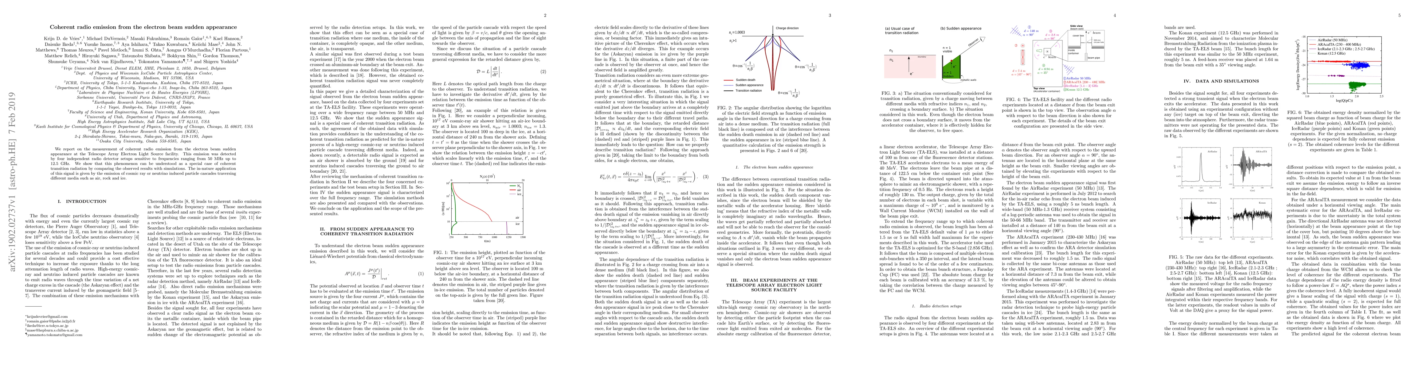 We report on the measurement of coherent radio emission from the electron beam sudden appearance at the Telescope Array Electron Light Source facility. This emission was detected by four independent radio detector setups sensitive to frequencies ranging from 50 MHz up to 12.5 GHz. We show that this phenomenon can be understood as a special case of coherent transition radiation by comparing the observed results with simulations. The in-nature application of this signal is given by the emission of cosmic ray or neutrino induced particle cascades traversing different media such as air, rock and ice.