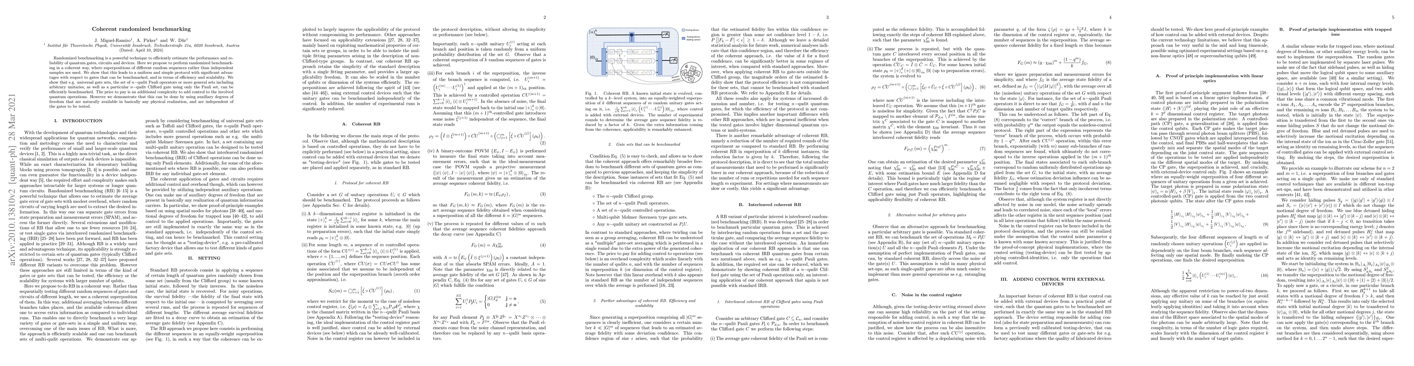 This paper proposes a coherent approach to randomized benchmarking, utilizing superpositions of random sequences to benchmark quantum gates and circuits more efficiently. This method enhances scalability and allows for the benchmarking of universal gate sets and $n-$qudit Pauli operators, albeit with added control complexity that can be managed using auxiliary degrees of freedom.