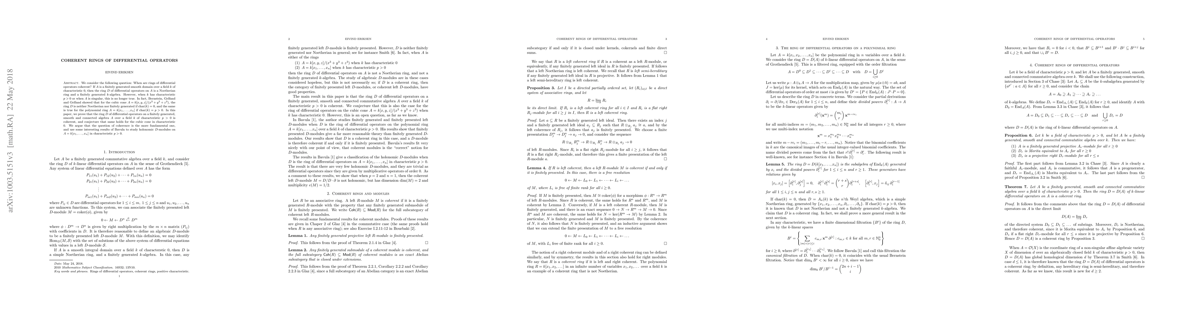 We consider the following question: When are rings of differential operators coherent? If $A$ is a finitely generated smooth domain over a field $k$ of characteristic $0$, then the ring $D$ of differential operators on $A$ is a Noetherian ring and a finitely generated $k$-algebra. However, when $k$ has characteristic $p > 0$ or when $A$ is singular, this is no longer true. In fact, Bernstein, Gelfand and Gelfand showed that for the cubic cone $A = k[x,y,z]/(x^3 + y^3 + z^3)$, the ring $D$ is neither Noetherian nor finitely generated if $k$ has characteristic $0$, and the same is true for the polynomial ring $A = k[x_1, \dots, x_n]$ if $k$ has characteristic $p > 0$. In this paper, we prove that the ring $D$ of differential operators on a finitely generated, smooth and connected algebra $A$ over a field $k$ of characteristic $p > 0$ is coherent, and conjecture that same holds for the cubic cone in characteristic $0$. We argue that the question of coherence is the more fundamental one, and use some interesting results of Bavula to study holonomic $D$-modules on $A = k[x_1, \dots, x_n]$ in characteristic $p > 0$.