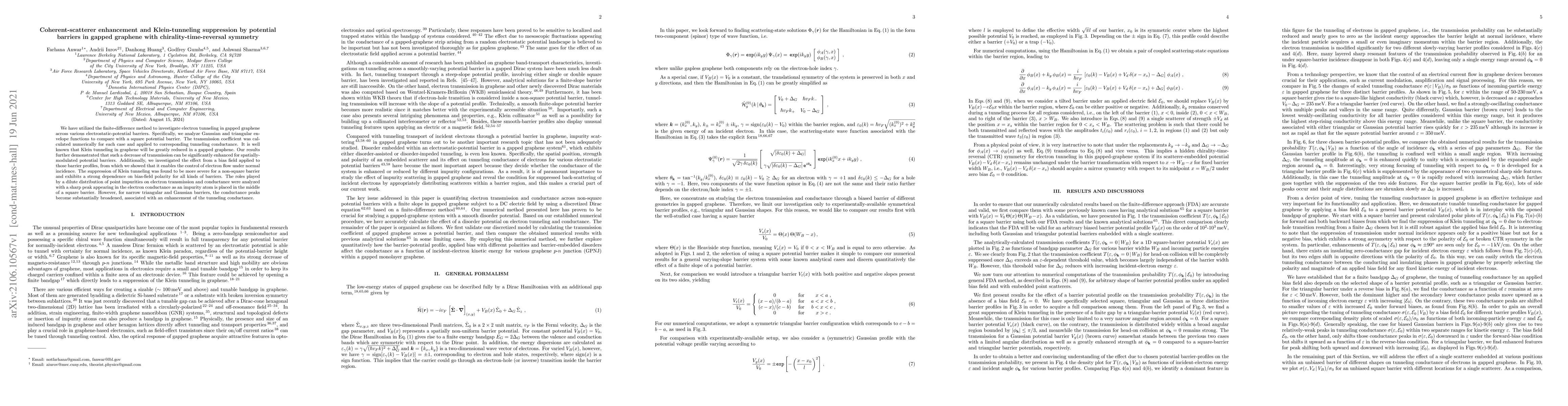 This paper investigates electron tunneling in gapped graphene through various potential barriers, showing that coherent-scatterer enhancement and Klein-tunneling suppression can be significantly controlled by barrier shape and bias field. The study finds that non-square barriers and specific bias polarities enhance suppression, while point impurities can lead to sharp conductance peaks under certain conditions.