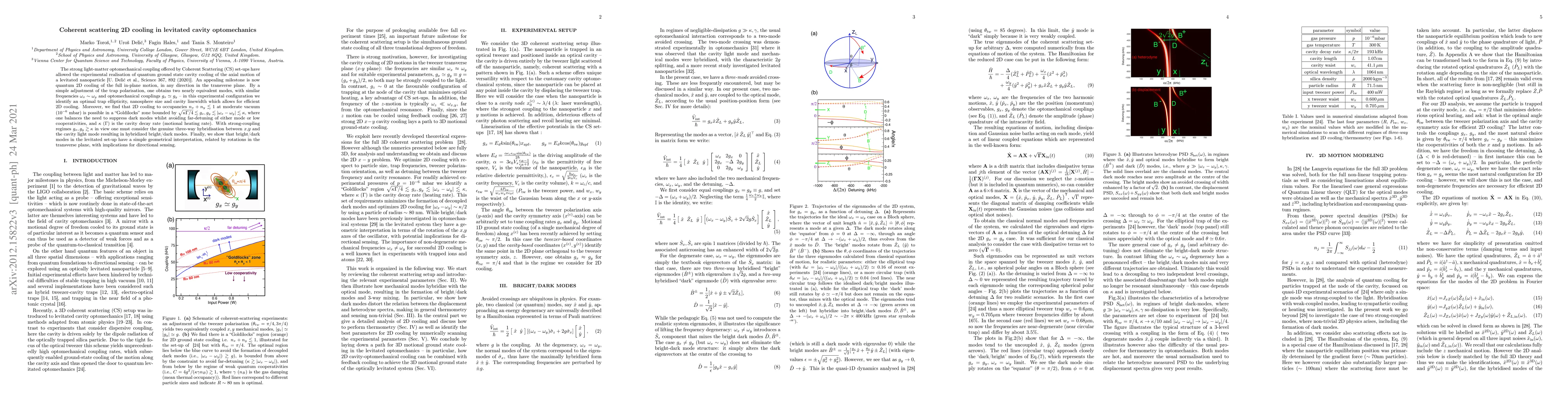 The strong light-matter optomechanical coupling offered by Coherent Scattering (CS) set-ups have allowed the experimental realisation of quantum ground state cavity cooling of the axial motion of a levitated nanoparticle [U. Deli\'{c} et al., Science 367, 892 (2020)]. An appealing milestone is now quantum 2D cooling of the full in-plane motion, in any direction in the transverse plane. By a simple adjustment of the trap polarisation, one obtains two nearly equivalent modes, with similar frequencies $\omega_{x}\sim\omega_{y}$ and optomechanical couplings $g_{x}\simeq g_{y}$ -- in this experimental configuration we identify an optimal trap ellipticity, nanosphere size and cavity linewidth which allows for efficient 2D cooling. Moreover, we find that 2D cooling to occupancies $n_{x}+n_{y}\lesssim1$ at moderate vacuum ($10^{-6}$ mbar) is possible in a "Goldilocks" zone bounded by $\sqrt{\kappa\Gamma/4}\lesssim g_{x},g_{y}\lesssim|\omega_{x}-\omega_{y}|\lesssim\kappa$, where one balances the need to suppress dark modes whilst avoiding far-detuning of either mode or low cooperativities, and $\kappa$ ($\Gamma$) is the cavity decay rate (motional heating rate). With strong-coupling regimes $g_{x},g_{y}\gtrsim\kappa$ in view one must consider the genuine three-way hybridisation between $x$, $y$ and the cavity light mode resulting in hybridized bright/dark modes. Finally, we show that bright/dark modes in the levitated set-up have a simple geometrical interpretation, related by rotations in the transverse plane, with implications for directional sensing.