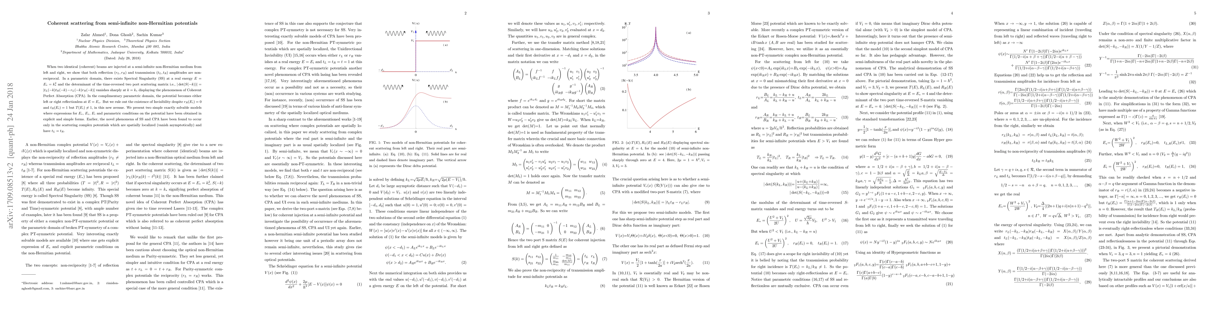 When two identical (coherent) beams are injected at a semi-infinite non-Hermitian medium from left and right, we show that both reflection $(r_L,r_R)$ and transmission $(t_L,t_R)$ amplitudes are non-reciprocal. In a parametric domain, there exists Spectral Singularity (SS) at a real energy $E=E_*$ and the determinant of the time-reversed two port S-matrix i.e., $|\det(S)|=|t_L t_R-r_L r_R|$ vanishes sharply at $E=E_*$ displaying the phenomenon of Coherent Perfect Absorption (CPA). In the complimentary parametric domain, the potential becomes either left or right reflectionless at $E=E_z$. But we rule out the existence of Invisibility despite $r_R(E_i)=0$ and $t_R(E_i)=1$ in these new models. We present two simple exactly solvable models where the expressions for $E_*$, $E_z$, $E_i$ and the parametric conditions on the potential have been obtained in explicit and simple forms. Earlier, the novel phenomena of SS and CPA have been found to occur only in the scattering complex potentials which are spatially localized (vanish asymptotically) and having $t_L=t_R$.