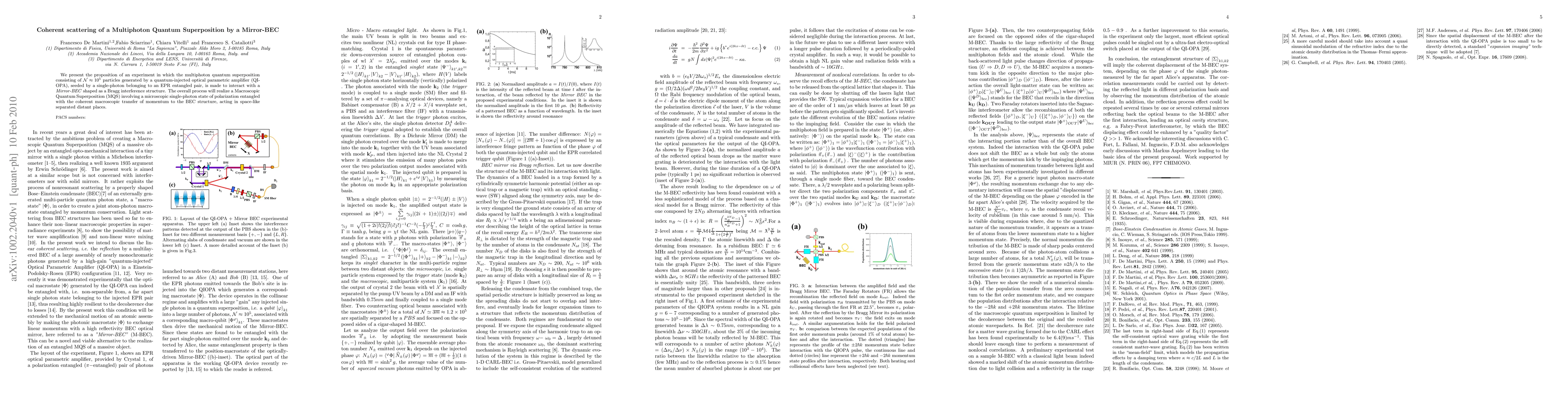 This paper proposes an experiment to demonstrate coherent scattering of a multiphoton quantum superposition through a Mirror-BEC, generating a Macroscopic Quantum Superposition (MQS) by transferring momentum to a Bragg interference structure, utilizing entangled photons and a quantum-injected optical parametric amplifier. The experiment aims to showcase the interaction between a macroscopic quantum state and a microscopic entangled state over distant locations.