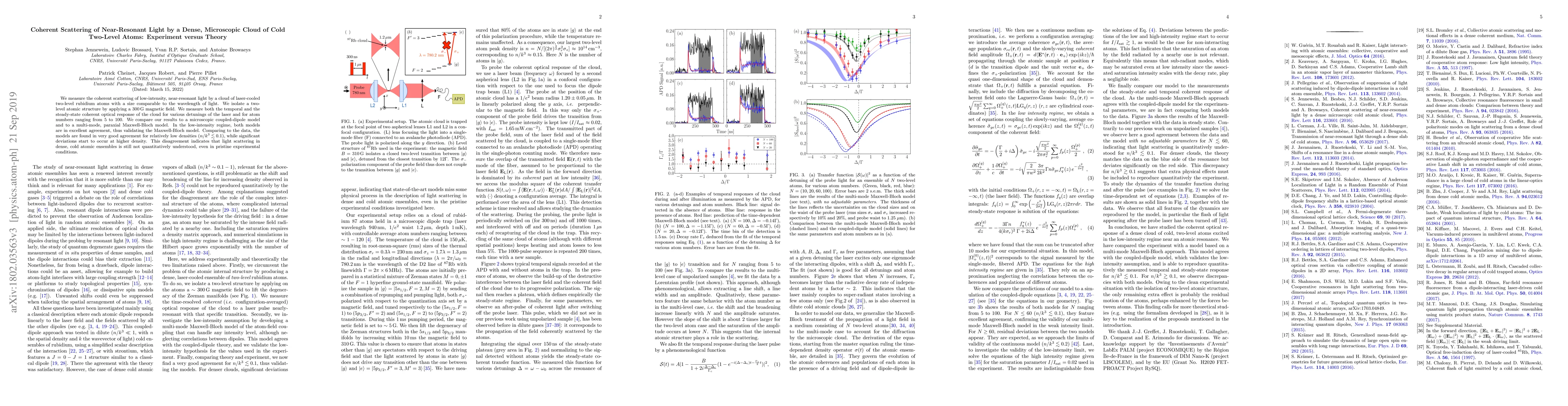 This paper measures the coherent scattering of near-resonant light by a dense cloud of cold rubidium atoms and compares experimental results to theoretical models, finding good agreement at low densities but significant deviations at higher densities, indicating a gap in understanding light scattering in dense atomic ensembles.