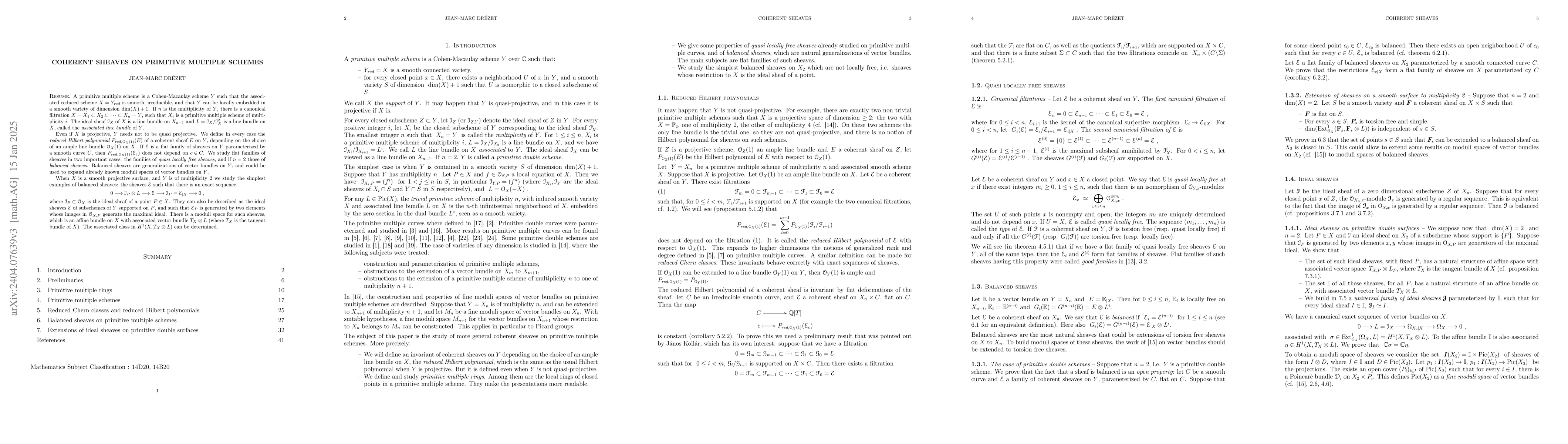 This paper investigates coherent sheaves on primitive multiple schemes, focusing on their reduced Hilbert polynomials and flat families. It introduces balanced sheaves, a generalization of vector bundles, and studies their moduli space when the underlying scheme is a smooth projective surface of multiplicity 2, highlighting an exact sequence that characterizes these sheaves.