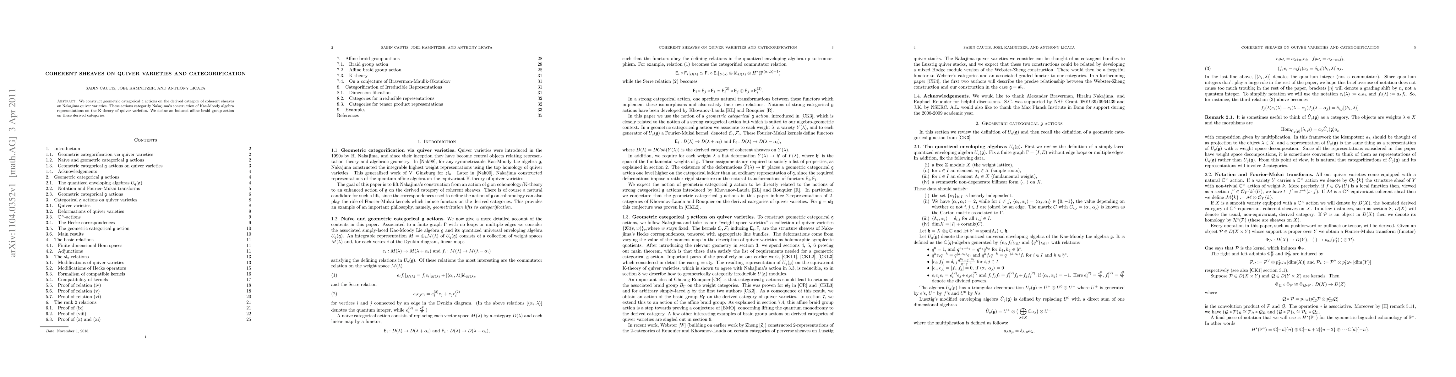 Summary: The paper constructs Lie algebra actions on the derived category of coherent sheaves on Nakajima quiver varieties, categorifying Nakajima's construction of Kac-Moody algebra representations, and introduces an affine braid group action on these categories.