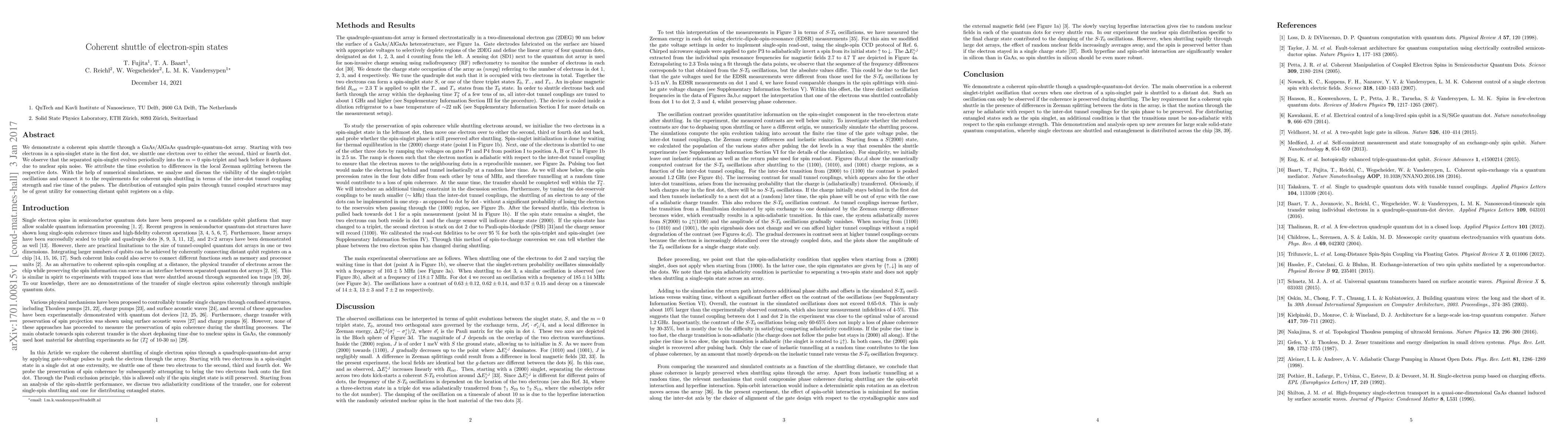 We demonstrate a coherent spin shuttle through a GaAs/AlGaAs quadruple-quantum-dot array. Starting with two electrons in a spin-singlet state in the first dot, we shuttle one electron over to either the second, third or fourth dot. We observe that the separated spin-singlet evolves periodically into the $m=0$ spin-triplet and back before it dephases due to nuclear spin noise. We attribute the time evolution to differences in the local Zeeman splitting between the respective dots. With the help of numerical simulations, we analyse and discuss the visibility of the singlet-triplet oscillations and connect it to the requirements for coherent spin shuttling in terms of the inter-dot tunnel coupling strength and rise time of the pulses. The distribution of entangled spin pairs through tunnel coupled structures may be of great utility for connecting distant qubit registers on a chip.