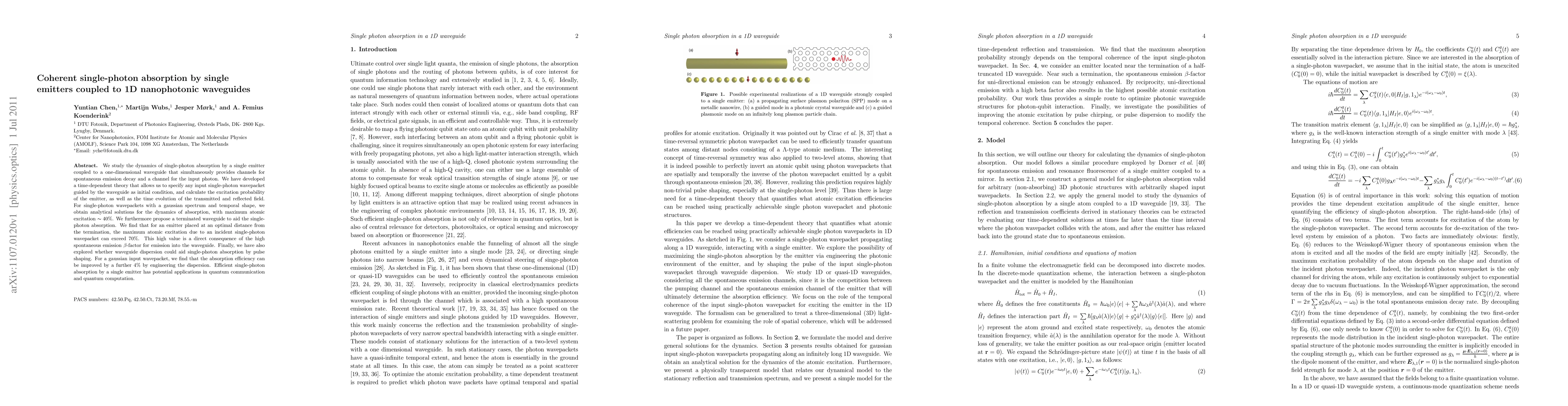 We study the dynamics of single-photon absorption by a single emitter coupled to a one-dimensional waveguide that simultaneously provides channels for spontaneous emission decay and a channel for the input photon. We have developed a time-dependent theory that allows us to specify any input single-photon wavepacket guided by the waveguide as initial condition, and calculate the excitation probability of the emitter, as well as the time evolution of the transmitted and reflected field. For single-photon wavepackets with a gaussian spectrum and temporal shape, we obtain analytical solutions for the dynamics of absorption, with maximum atomic excitation $\thicksim 40%$. We furthermore propose a terminated waveguide to aid the single-photon absorption. We find that for an emitter placed at an optimal distance from the termination, the maximum atomic excitation due to an incident single-photon wavepacket can exceed 70%. This high value is a direct consequence of the high spontaneous emission $\beta$-factor for emission into the waveguide. Finally, we have also explored whether waveguide dispersion could aid single-photon absorption by pulse shaping. For a gaussian input wavepacket, we find that the absorption efficiency can be improved by a further 4% by engineering the dispersion. Efficient single-photon absorption by a single emitter has potential applications in quantum communication and quantum computation.