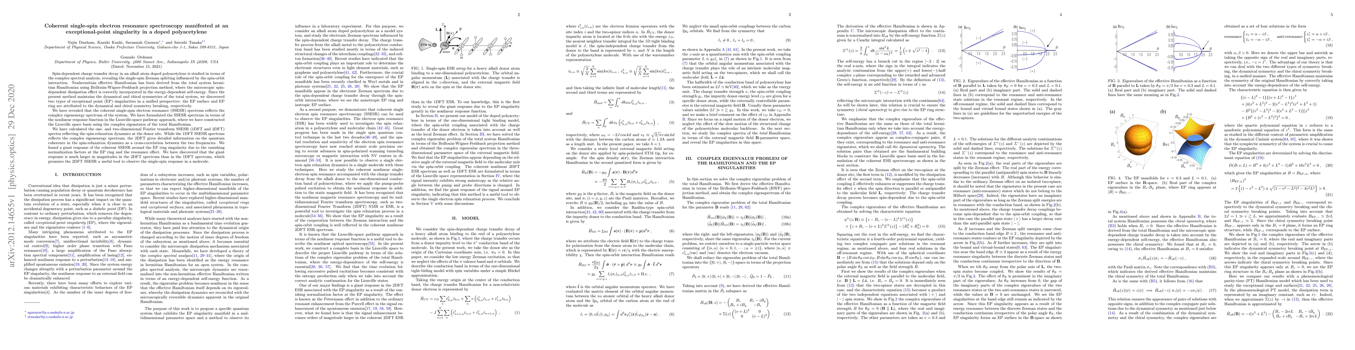 Spin-dependent charge transfer decay in an alkali atom doped polyacetylene is studied in terms of the complex spectral analysis, revealing the single-spin Zeeman splitting influenced by the spin-orbit interaction. Nonhermitian effective Hamiltonian has been derived from the total system hermitian Hamiltonian using Brillouin-Wigner-Feshbach projection method, where the microscopic spin-dependent dissipation effect is correctly incorporated in the energy-dependent self-energy. Since the present method maintains the dynamical and chiral symmetries of the total system, we discovered two types of exceptional point (EP) singularities in a unified perspective: the EP surface and EP ring are attributed to the dynamical and chiral symmetry breaking, respectively. We have revealed that the coherent single-spin electron resonance (SSESR) spectrum reflects the complex eigenenergy spectrum of the system. We have formulated the SSESR spectrum in terms of the nonlinear response function in the Liouville-space pathway approach, where we have constructed the Liouville space basis using the complex eigenstates of the total Hamiltonian. We have calculated the one- and two-dimensional Fourier transform SSESR (1DFT and 2DFT) spectra reflecting the spin-relaxation dynamics at the donor site. While the 1DFT SSESR spectrum reflects the complex eigenenergy spectrum, the 2DFT gives detailed information on the quantum coherence in the spin-relaxation dynamics as a cross-correlation between the two frequencies. We found a giant response of the coherent SSESR around the EP ring singularity due to the vanishing normalization factors at the EP ring and the resonance effect. We have discovered that the giant response is much larger in magnitudes in the 2DFT spectrum than in the 1DFT spectrum, which promises the 2DFT SSESR a useful tool to observe the single-spin response in a molecule.
