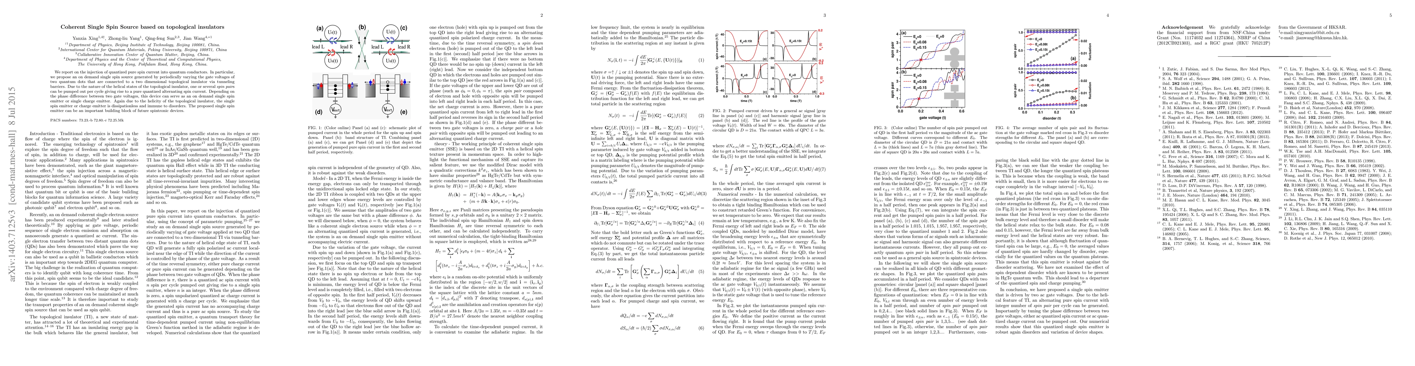 This research introduces a method to generate a coherent single spin source using topological insulators, achieved by periodically modulating gate voltages on connected quantum dots. This creates a quantized alternating spin current, functioning as an on-demand spin or charge emitter, with dissipationless and disorder-immune properties, potentially serving as a crucial component in future spintronic devices.