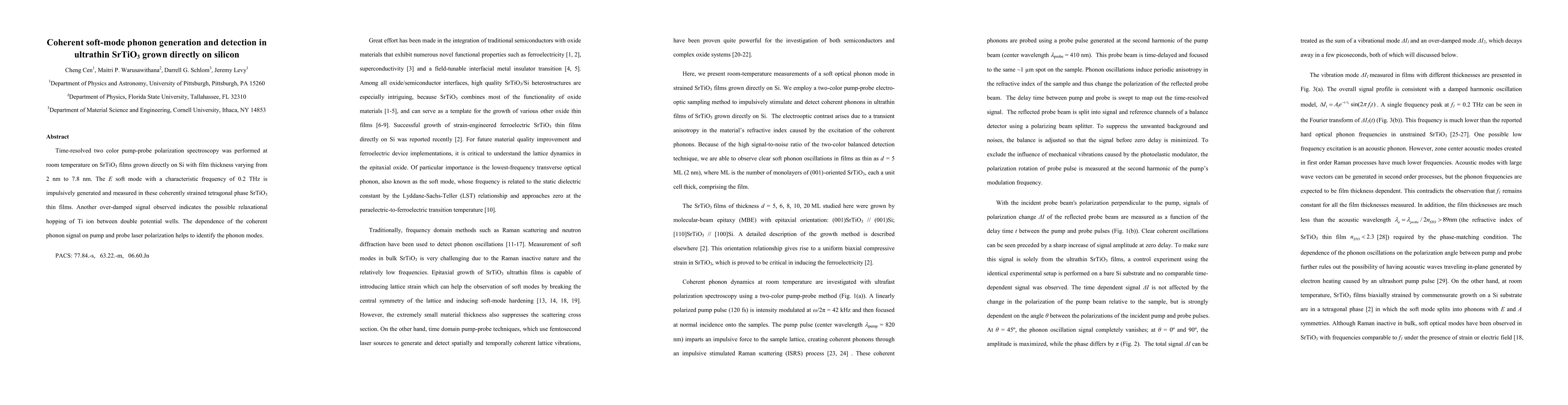 This paper investigates the generation and detection of coherent soft-mode phonons in ultrathin SrTiO3 films grown directly on silicon using time-resolved two-color pump-probe spectroscopy. The study reveals an E soft mode at 0.2 THz and suggests Ti ion relaxational hopping, with polarization dependence aiding in phonon mode identification.