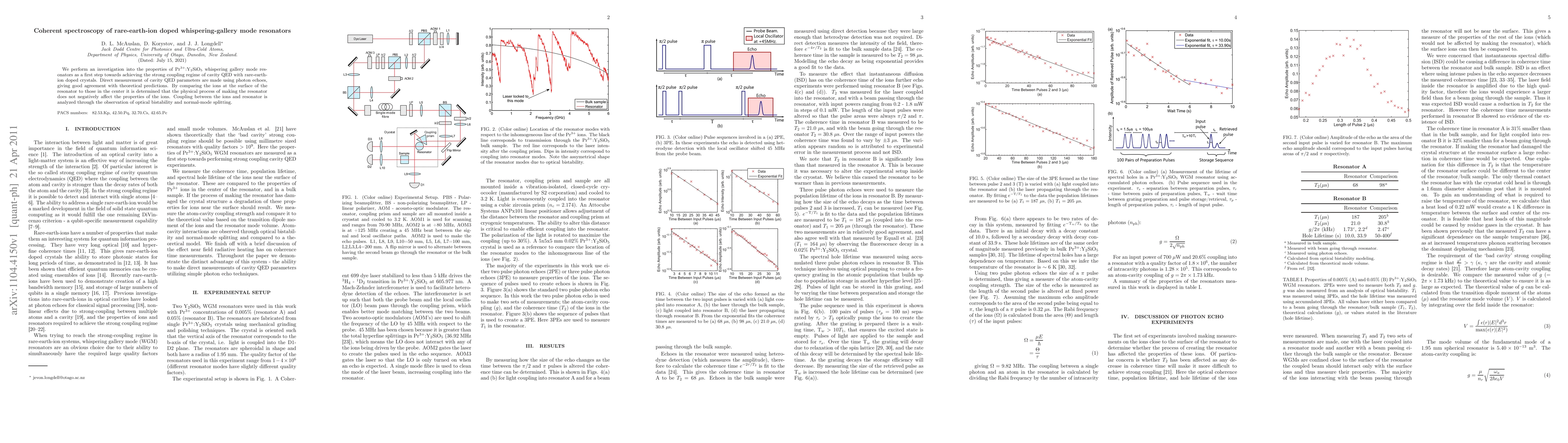 This paper investigates Pr³⁺:Y₂SiO₅ whispering-gallery mode resonators for cavity QED applications, demonstrating strong coupling potential through photon echo measurements and optical bistability. It confirms that resonator fabrication does not degrade the ions' properties.