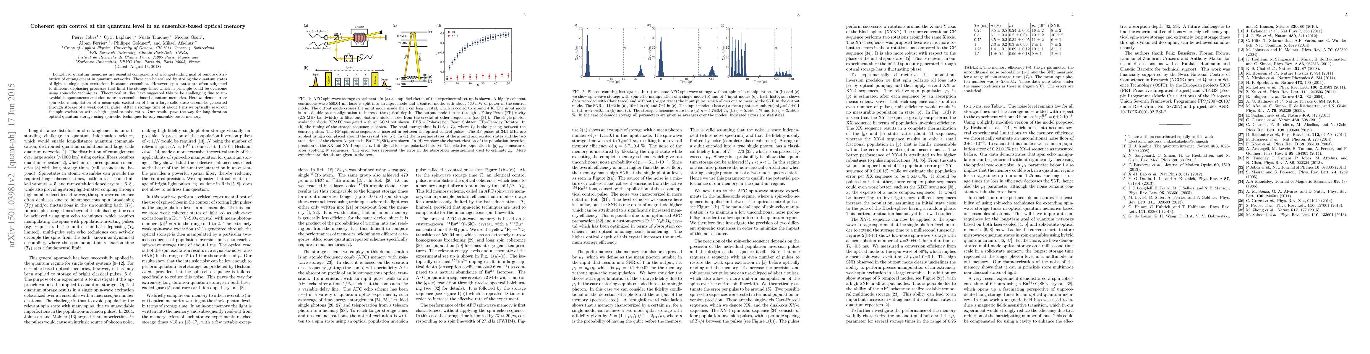 This paper demonstrates coherent spin control using spin-echo techniques in an ensemble-based optical memory, overcoming dephasing issues to achieve long-lived quantum storage of light states. The study successfully manipulates a mean spin excitation of 1 in a solid-state ensemble, enabling high-fidelity optical readout after a storage time of about 1 ms.