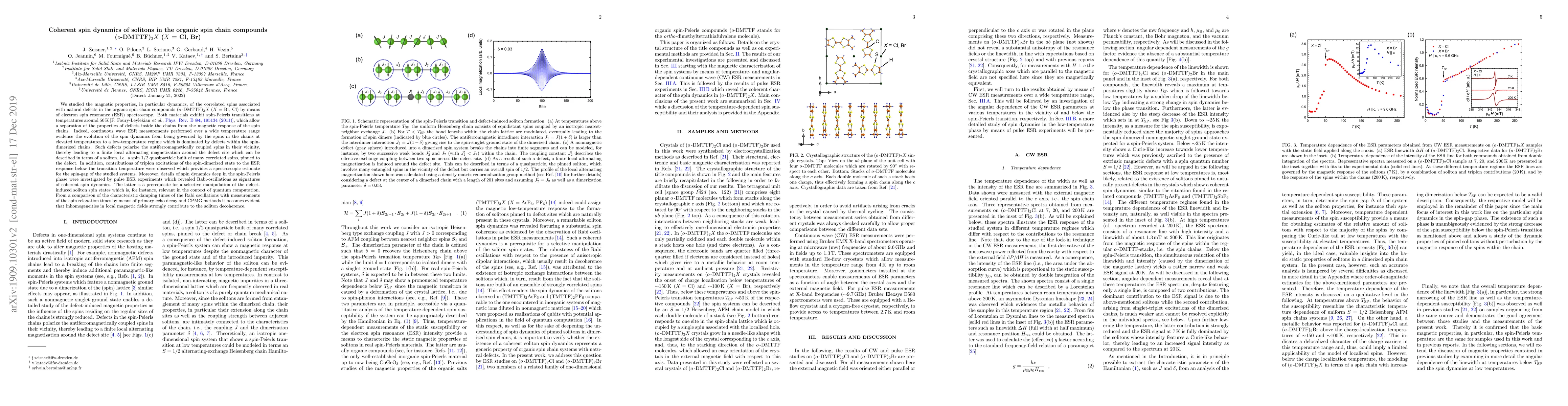 We studied the magnetic properties, in particular dynamics, of the correlated spins associated with natural defects in the organic spin chain compounds ($o$-DMTTF)$_2X$ ($X$ = Br, Cl) by means of electron spin resonance (ESR) spectroscopy. Both materials exhibit spin-Peierls transitions at temperatures around 50 K [P. Foury-Leylekian et al. Phys. Rev. B 84, 195134 (2011)], which allow a separation of the properties of defects inside the chains from the magnetic response of the spin chains. Indeed, continuous wave ESR measurements performed over a wide temperature range evidence the evolution of the spin dynamics from being governed by the spins in the chains at elevated temperatures to a low-temperature regime which is dominated by defects within the spin-dimerized chains. Such defects polarize the antiferromagnetically coupled spins in their vicinity, thereby leading to a finite local alternating magnetization around the defect site which can be described in terms of a soliton, i.e. a spin 1/2 quasiparticle built of many correlated spins, pinned to the defect. In addition, contributions of triplon excitations of the spin-dimerized state to the ESR response below the transition temperature were observed which provides a spectroscopic estimate for the spin-gap of the studied systems. Moreover, details of spin dynamics deep in the spin-Peierls phase were investigated by pulse ESR experiments which revealed Rabi-oscillations as signatures of coherent spin dynamics. From a comparison of the characteristic damping times of the Rabi oscillations with measurements of the spin relaxation times by means of primary-echo decay and CPMG methods it becomes evident that inhomogeneities in local magnetic fields strongly contribute to the soliton decoherence.