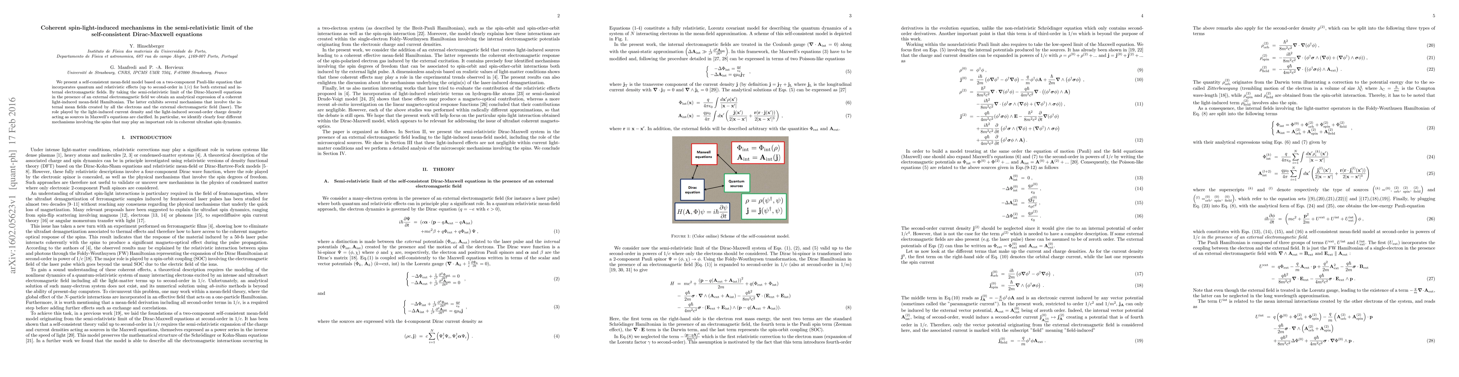 We present a self-consistent mean-field model based on a two-component Pauli-like equation that incorporates quantum and relativistic effects (up to second-order in 1/c) for both external and internal electromagnetic fields. By taking the semi-relativistic limit of the Dirac-Maxwell equations in the presence of an external electromagnetic field we obtain an analytical expression of a coherent light-induced mean-field Hamiltonian. The latter exhibits several mechanisms that involve the internal mean fields created by all the electrons and the external electromagnetic field (laser). The role played by the light-induced current density and the light-induced second-order charge density acting as sources in Maxwell's equations are clarified. In particular, we identify clearly four different mechanisms involving the spins that may play an important role in coherent ultrafast spin dynamics.