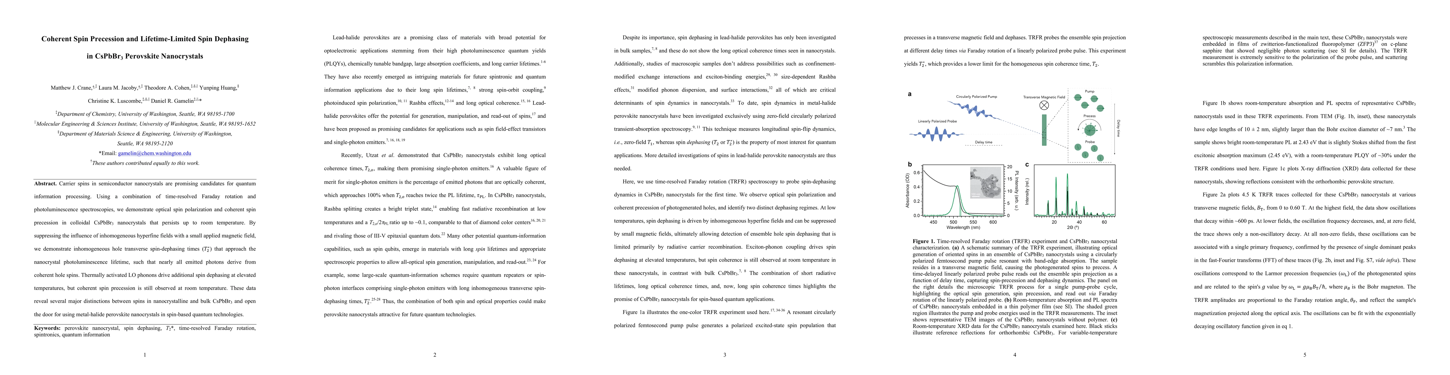 This paper demonstrates optical spin polarization and coherent spin precession in CsPbBr3 perovskite nanocrystals, showing that these processes persist up to room temperature. The study reveals that inhomogeneous hole transverse spin-dephasing times approach the nanocrystal photoluminescence lifetime, indicating potential for spin-based quantum technologies.