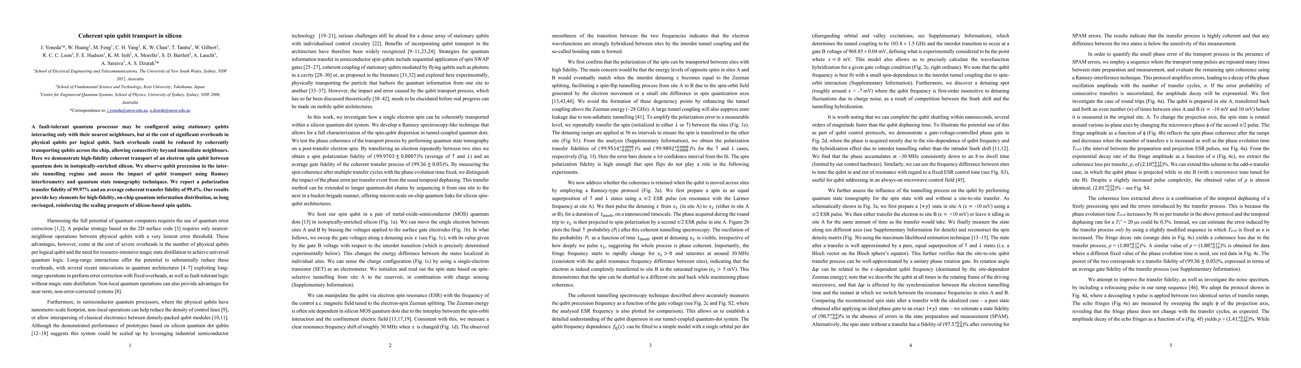 This paper demonstrates high-fidelity coherent transport of electron spin qubits between quantum dots in silicon, achieving a polarization transfer fidelity of 99.97% and a coherent transfer fidelity of 99.4%, thus supporting the scaling potential of silicon-based quantum processors.