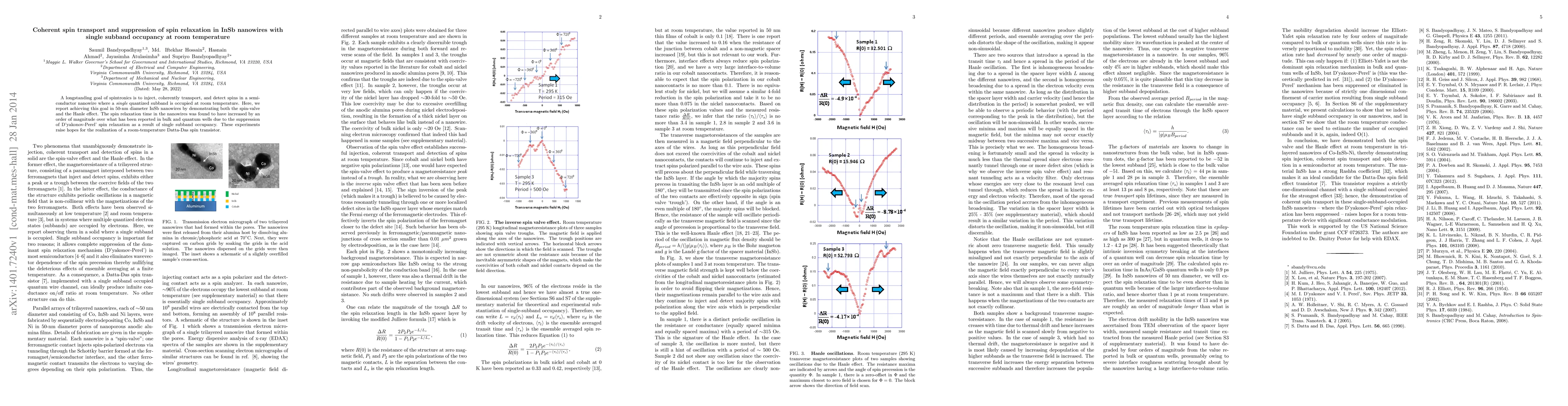 InSb nanowires with single subband occupancy demonstrate coherent spin transport and significantly enhanced spin relaxation time, achieving both spin-valve and Hanle effects, potentially enabling room-temperature Datta-Das spin transistor operation.