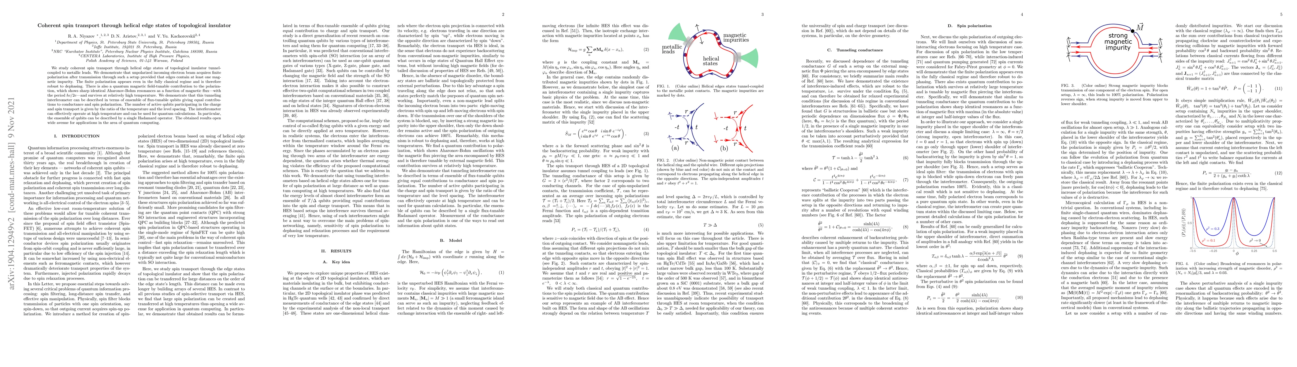 This paper investigates coherent spin transport through helical edge states in topological insulators tunnel-coupled to metallic leads, demonstrating that unpolarized electron beams acquire finite polarization due to magnetic impurities. The study shows a quantum magnetic field-tunable contribution to polarization, robust against dephasing, and suggests potential for quantum computing applications through a tunneling interferometer described by a single Hadamard operator.