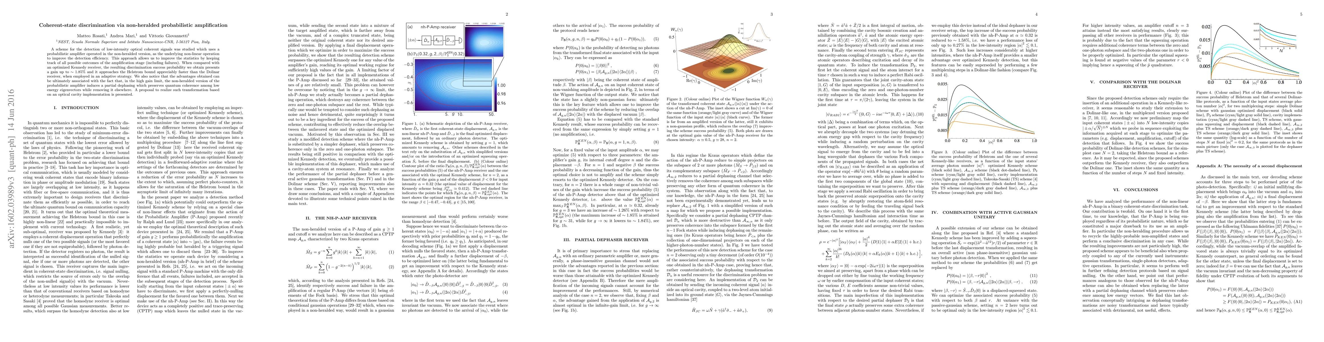 A scheme for the detection of low-intensity optical coherent signals was studied which uses a probabilistic amplifier operated in the non-heralded version, as the underlying non-linear operation to improve the detection efficiency. This approach allows us to improve the statistics by keeping track of all possible outcomes of the amplification stage (including failures). When compared with an optimized Kennedy receiver, the resulting discrimination success probability we obtain presents a gain up to ~1.85% and it approaches the Helstrom bound appreciably faster than the Dolinar receiver, when employed in an adaptive strategy. We also notice that the advantages obtained can be ultimately associated with the fact that, in the high gain limit, the non-heralded version of the probabilistic amplifier induces a partial dephasing which preserves quantum coherence among low energy eigenvectors while removing it elsewhere. A proposal to realize such transformation based on an optical cavity implementation is presented.