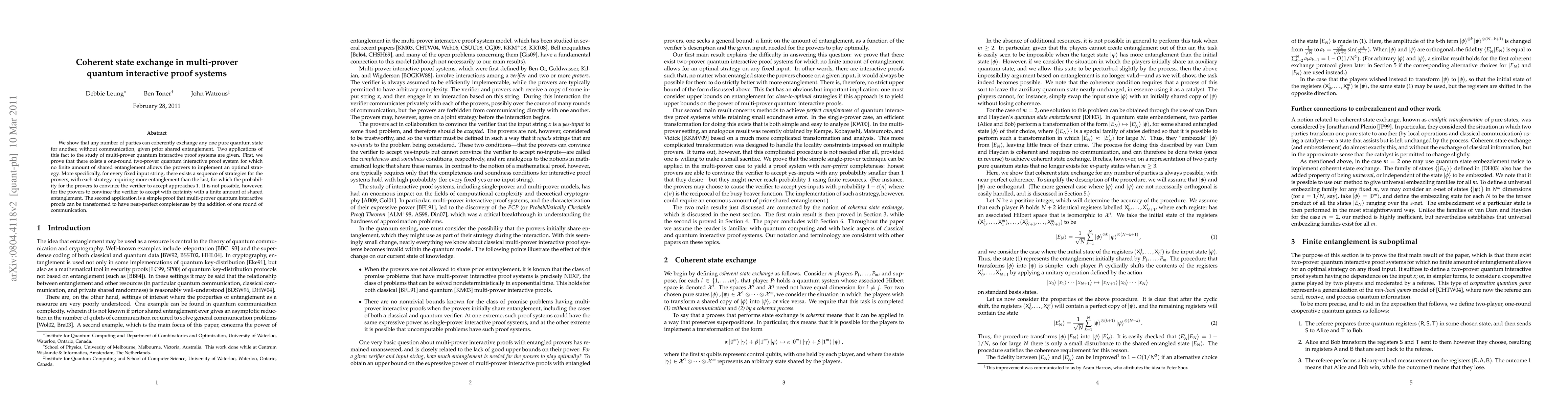 We show that any number of parties can coherently exchange any one pure quantum state for another, without communication, given prior shared entanglement. Two applications of this fact to the study of multi-prover quantum interactive proof systems are given. First, we prove that there exists a one-round two-prover quantum interactive proof system for which no finite amount of shared entanglement allows the provers to implement an optimal strategy. More specifically, for every fixed input string, there exists a sequence of strategies for the provers, with each strategy requiring more entanglement than the last, for which the probability for the provers to convince the verifier to accept approaches 1. It is not possible, however, for the provers to convince the verifier to accept with certainty with a finite amount of shared entanglement. The second application is a simple proof that multi-prover quantum interactive proofs can be transformed to have near-perfect completeness by the addition of one round of communication.