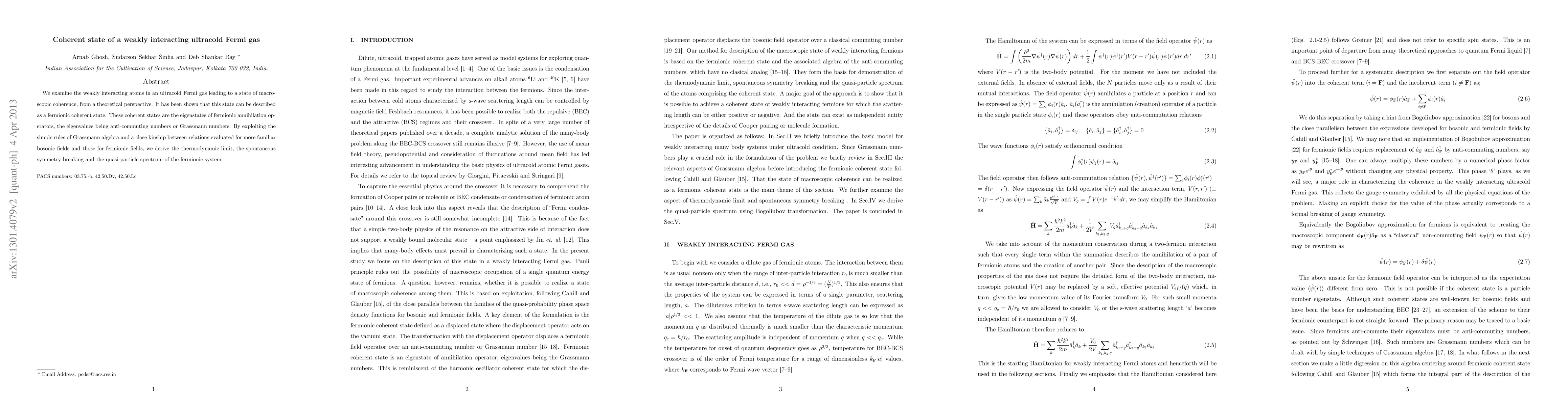 Researchers studied a type of gas where atoms interact weakly, leading to a state of macroscopic coherence that can be described as a fermionic coherent state. This discovery provides new insights into the thermodynamic limit, symmetry breaking, and quasi-particle spectrum of the system.