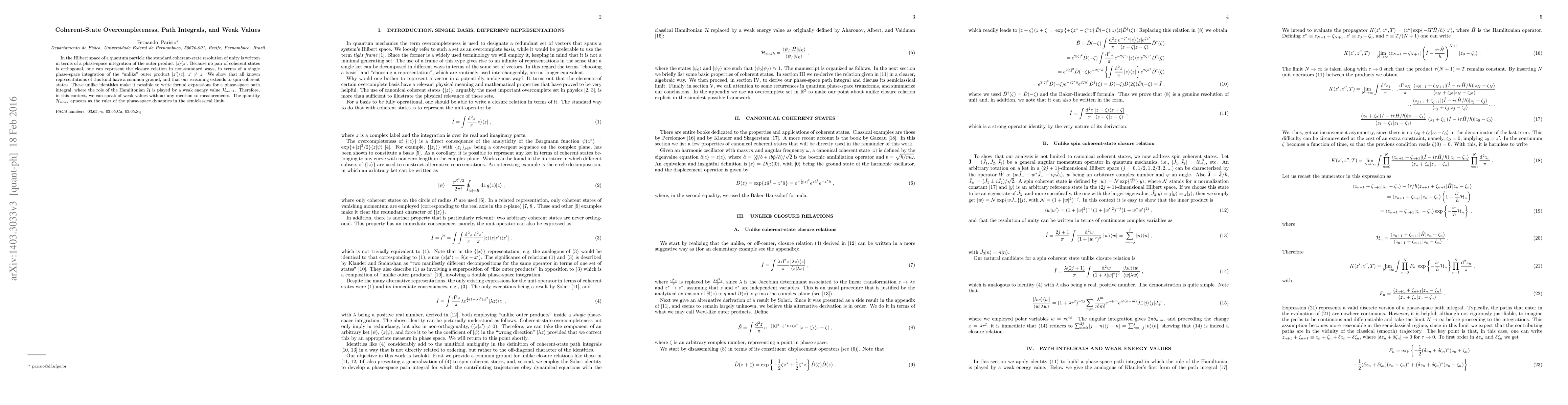 In the Hilbert space of a quantum particle the standard coherent-state resolution of unity is written in terms of a phase-space integration of the outer product $|z\rangle \langle z|$. Because no pair of coherent states is orthogonal, one can represent the closure relation in non-standard ways, in terms of a single phase-space integration of the "unlike" outer product $|z'\rangle \langle z|$, $z'\ne z$. We show that all known representations of this kind have a common ground, and that our reasoning extends to spin coherent states. These unlike identities make it possible to write formal expressions for a phase-space path integral, where the role of the Hamiltonian ${\cal H}$ is played by a weak energy value ${\cal H}_{weak}$. Therefore, in this context, we can speak of weak values without any mention to measurements. The quantity ${\cal H}_{weak}$ appears as the ruler of the phase-space dynamics in the semiclassical limit.