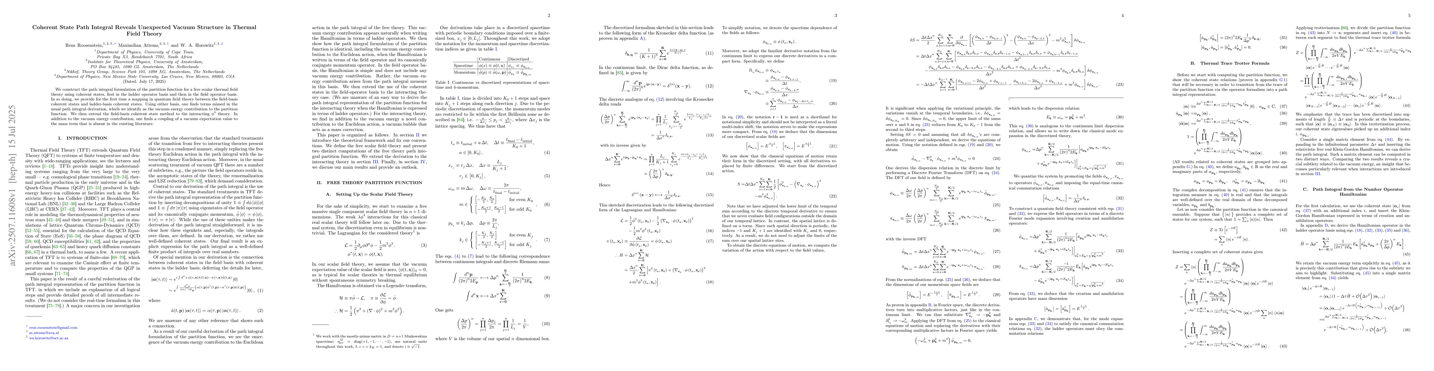 We construct the path integral formulation of the partition function for a free scalar thermal field theory using coherent states, first in the ladder operator basis and then in the field operator basis. In so doing, we provide for the first time a mapping in quantum field theory between the field-basis coherent states and ladder-basis coherent states. Using either basis, one finds terms missed in the usual path integral derivation, which we identify as the vacuum energy contribution to the partition function. We then extend the field-basis coherent state method to the interacting $\phi^4$ theory. In addition to the vacuum energy contribution, one finds a coupling of a vacuum expectation value to the mass term that is absent in the existing literature.
