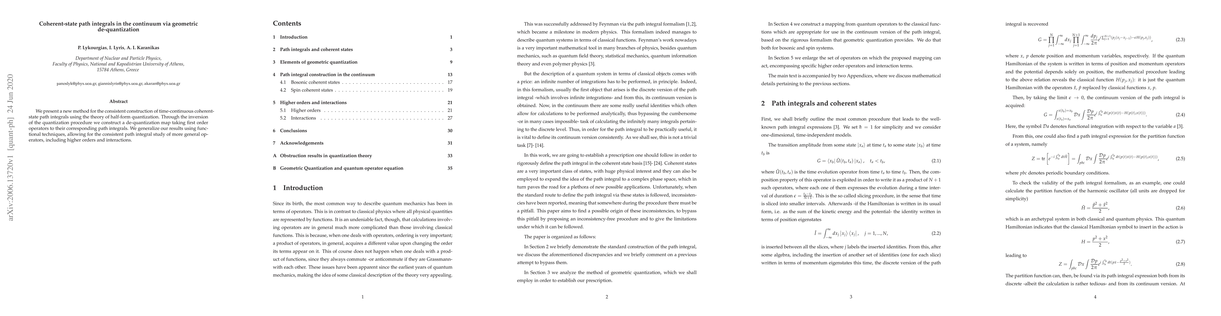 This paper introduces a novel method for constructing continuous-time coherent-state path integrals using geometric de-quantization and half-form quantization, and generalizes the approach to study a broader range of operators and interactions.