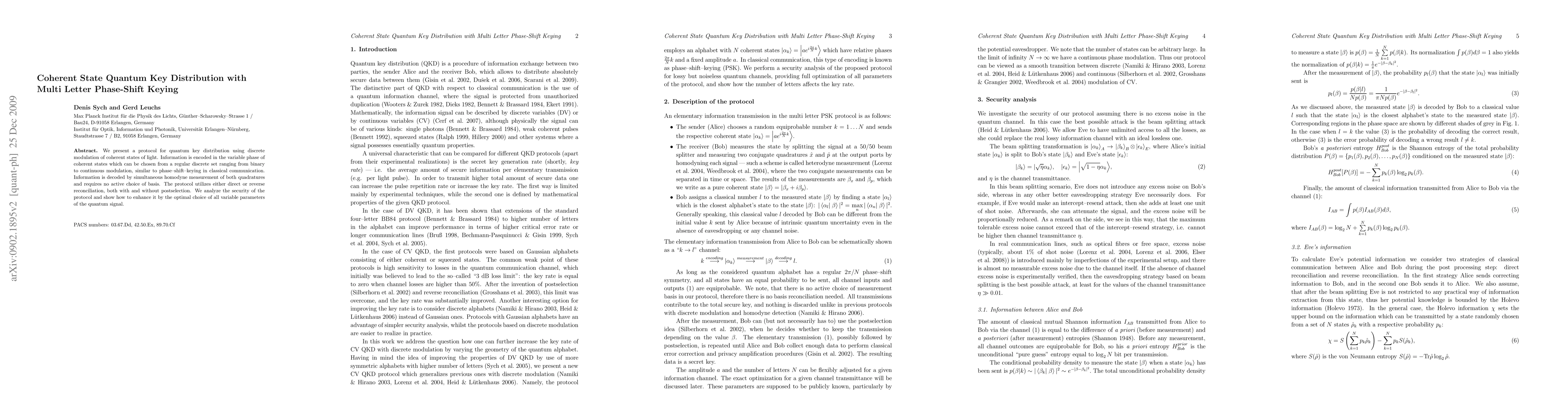 This paper proposes a quantum key distribution protocol using coherent states with multi-letter phase-shift keying, employing simultaneous homodyne measurement for decoding. The security is analyzed and enhanced through optimal parameter selection, utilizing reconciliation techniques.