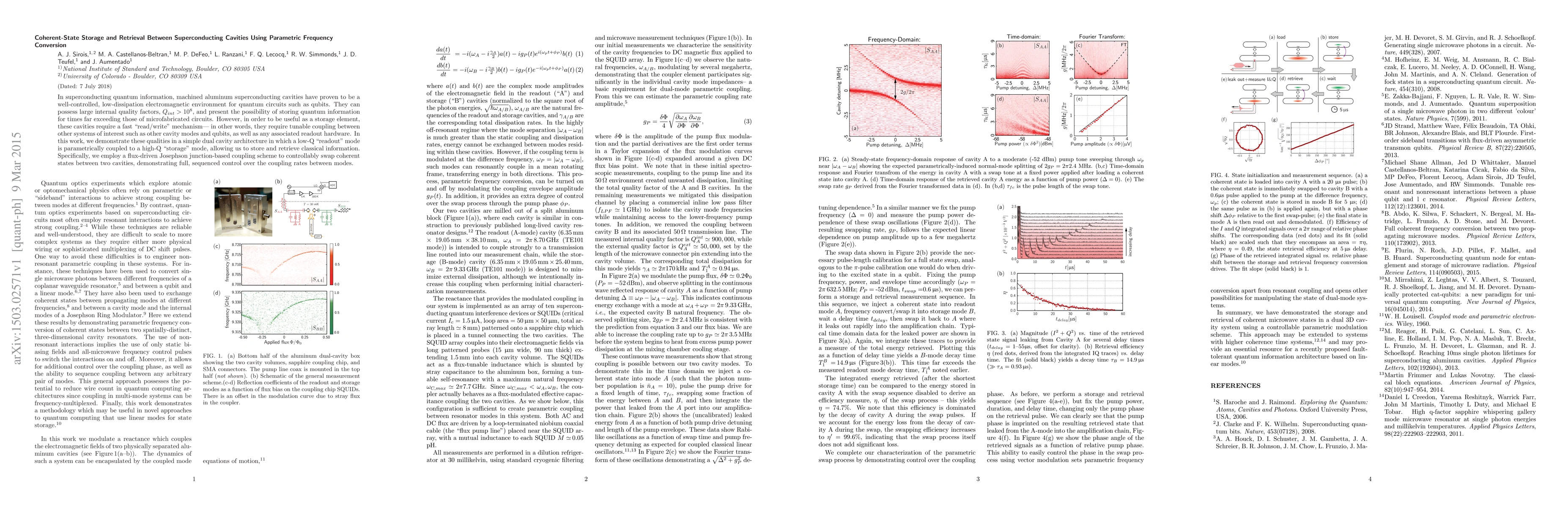 This paper demonstrates coherent-state storage and retrieval between superconducting cavities using parametric frequency conversion, showcasing a dual cavity architecture with tunable coupling for quantum information storage. The method employs a flux-driven Josephson junction to controllably swap coherent states, enabling full control over coupling rates.