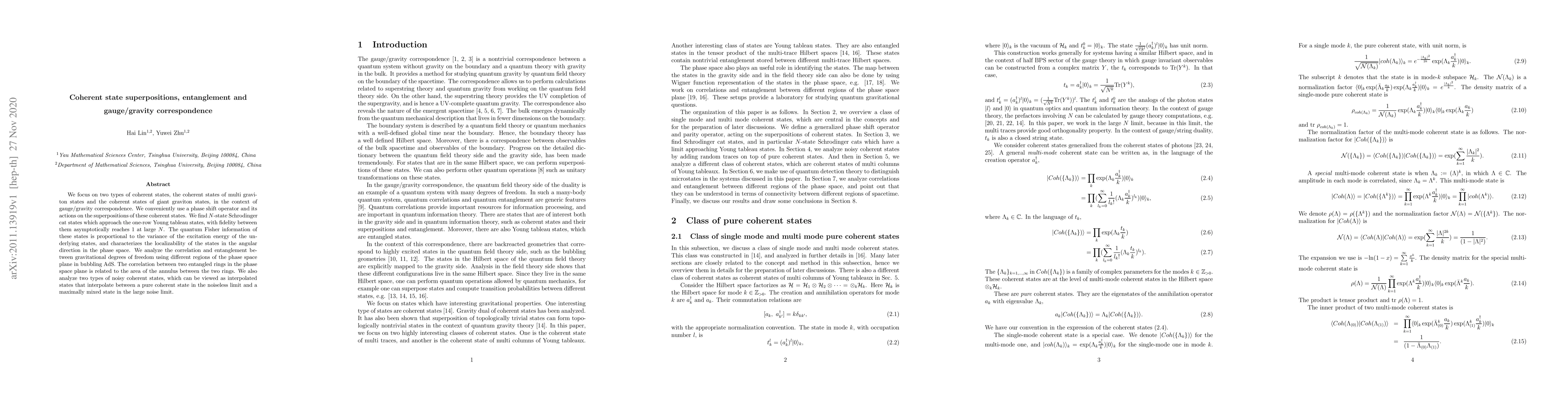 This paper explores coherent state superpositions in the context of gauge/gravity correspondence, focusing on multi-graviton and giant graviton states. It finds that $N$-state Schrödinger cat states approach one-row Young tableau states, with fidelity reaching 1 at large $N$, and analyzes entanglement and correlations in bubbling AdS using phase space regions.