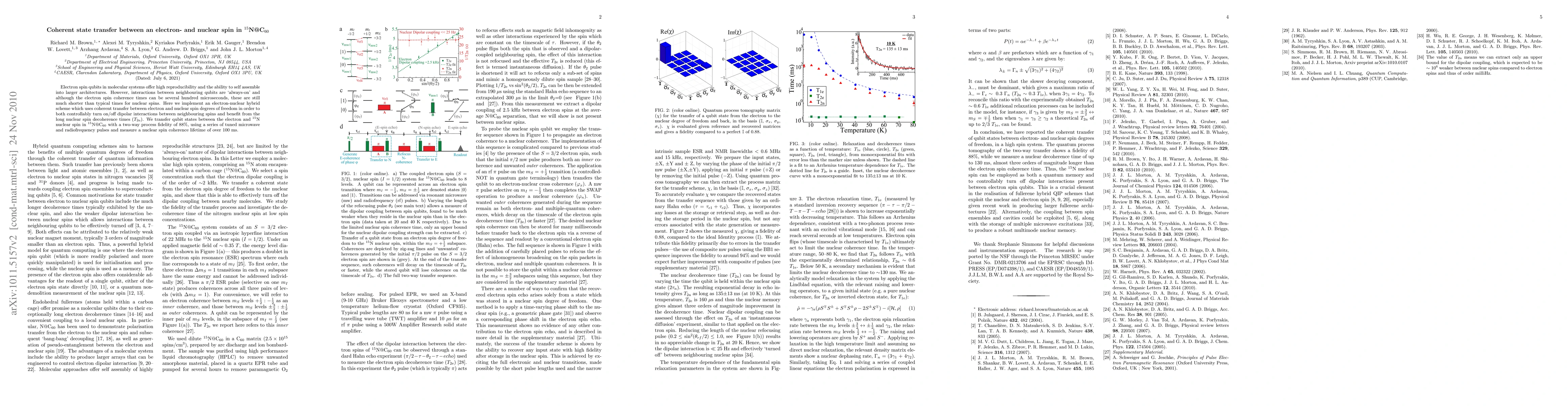 Electron spin qubits in molecular systems offer high reproducibility and the ability to self assemble into larger architectures. However, interactions between neighbouring qubits are 'always-on' and although the electron spin coherence times can be several hundred microseconds, these are still much shorter than typical times for nuclear spins. Here we implement an electron-nuclear hybrid scheme which uses coherent transfer between electron and nuclear spin degrees of freedom in order to both controllably turn on/off dipolar interactions between neighbouring spins and benefit from the long nuclear spin decoherence times (T2n). We transfer qubit states between the electron and 15N nuclear spin in 15N@C60 with a two-way process fidelity of 88%, using a series of tuned microwave and radiofrequency pulses and measure a nuclear spin coherence lifetime of over 100 ms.