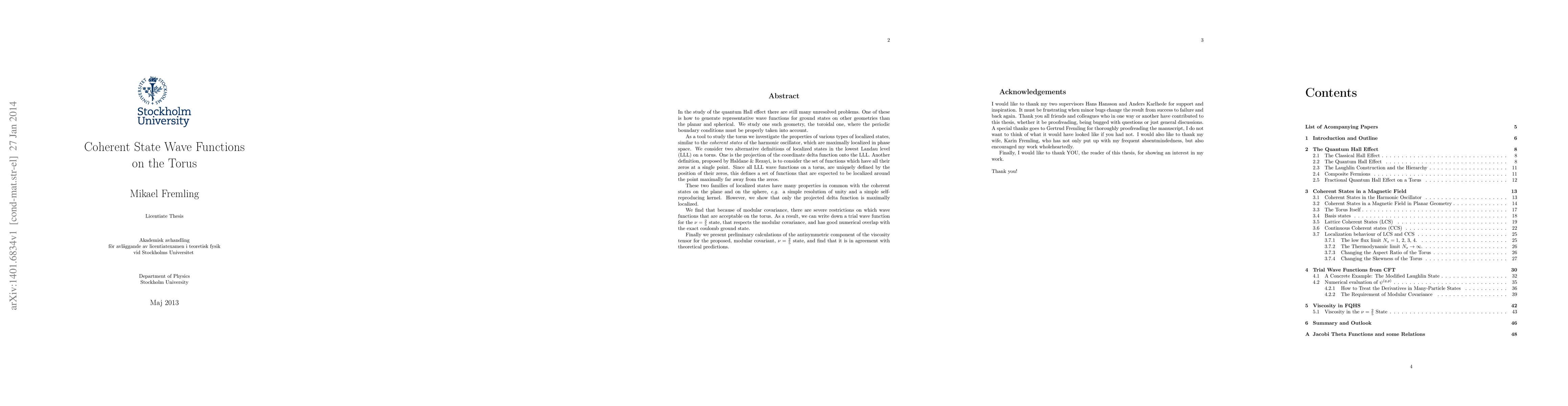 In the study of the quantum Hall effect there are still many unresolved problems. One of these is how to generate representative wave functions for ground states on other geometries than the planar and spherical. We study one such geometry, the toroidal one, where the periodic boundary conditions must be properly taken into account. As a tool to study the torus we investigate the properties of various types of localized states, similar to the coherent states of the harmonic oscillator, which are maximally localized in phase space. We consider two alternative definitions of localized states in the lowest Landau level (LLL) on a torus. One is the projection of the coordinate delta function onto the LLL. Another definition, proposed by Haldane & Rezayi, is to consider the set of functions which have all their zeros at a single point. Since all LLL wave functions on a torus, are uniquely defined by the position of their zeros, this defines a set of functions that are expected to be localized around the point maximally far away from the zeros. These two families of localized states have many properties in common with the coherent states on the plane and on the sphere, e.g. a simple resolution of unity and a simple self-reproducing kernel. However, we show that only the projected delta function is maximally localized. We find that because of modular covariance, there are severe restrictions on which wave functions that are acceptable on the torus. As a result, we can write down a trial wave function for the $\nu=\frac{2}{5}$ state, that respects the modular covariance, and has good numerical overlap with the exact coulomb ground state. Finally we present preliminary calculations of the antisymmetric component of the viscosity tensor for the proposed, modular covariant, $\nu=\frac{2}{5}$ state, and find that it is in agreement with theoretical predictions.