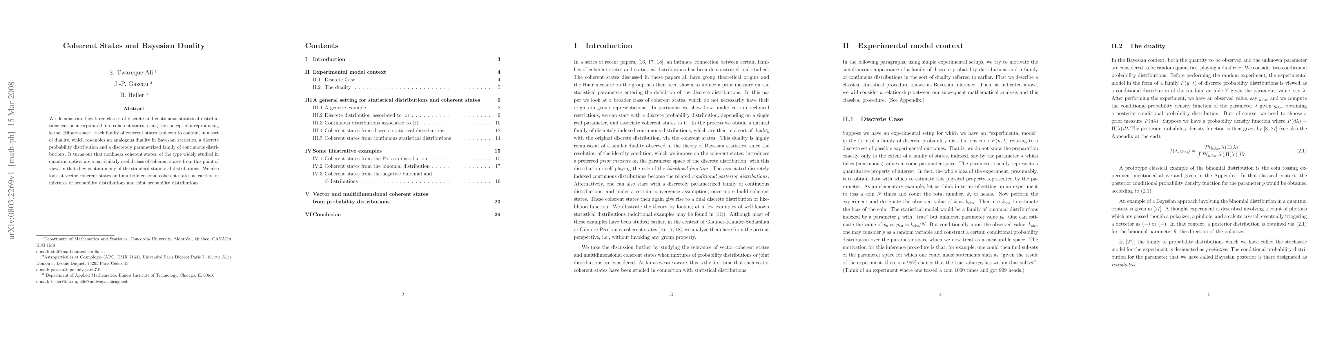 We demonstrate how large classes of discrete and continuous statistical distributions can be incorporated into coherent states, using the concept of a reproducing kernel Hilbert space. Each family of coherent states is shown to contain, in a sort of duality, which resembles an analogous duality in Bayesian statistics, a discrete probability distribution and a discretely parametrized family of continuous distributions. It turns out that nonlinear coherent states, of the type widely studied in quantum optics, are a particularly useful class of coherent states from this point of view, in that they contain many of the standard statistical distributions. We also look at vector coherent states and multidimensional coherent states as carriers of mixtures of probability distributions and joint probability distributions.