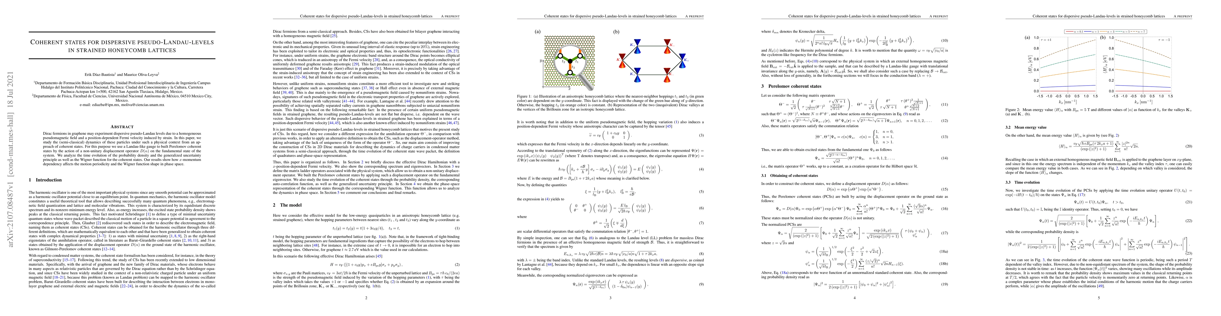 This paper investigates the dynamics of Dirac fermions in strained graphene, focusing on dispersive pseudo-Landau levels. It constructs Perelomov coherent states using a non-unitary displacement operator and analyzes their time evolution, revealing how $x$-momentum dependency influences motion periodicity and the Wigner function's shape in phase space.