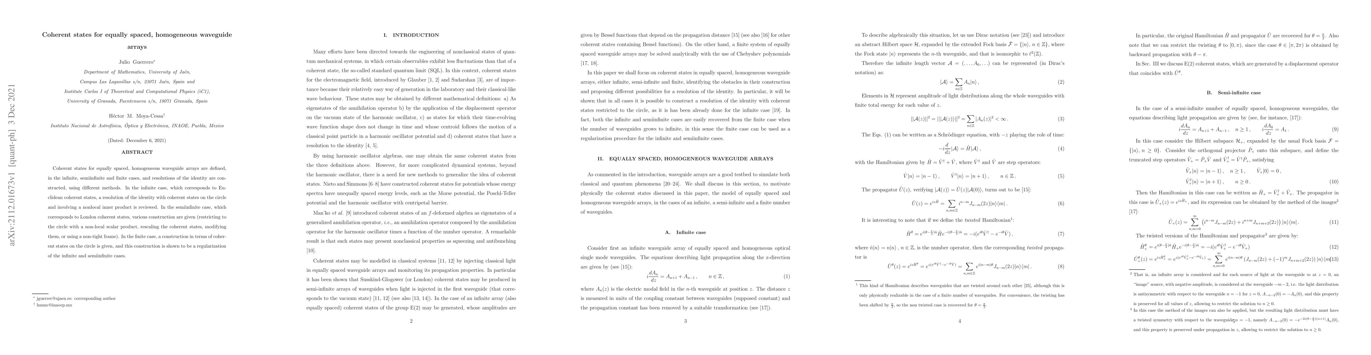 Coherent states for equally spaced, homogeneous waveguide arrays are defined, in the infinite, semiinfinite and finite cases, and resolutions of the identity are constructed, using different methods. In the infinite case, which corresponds to Euclidean coherent states, a resolution of the identity with coherent states on the circle and involving a nonlocal inner product is reviewed. In the semiinfinite case, which corresponds to London coherent states, various construction are given (restricting to the circle with a non-local scalar product, rescaling the coherent states, modifying them, or using a non-tight frame). In the finite case, a construction in terms of coherent states on the circle is given, and this construction is shown to be a regularization of the infinite and semiinfinite cases.