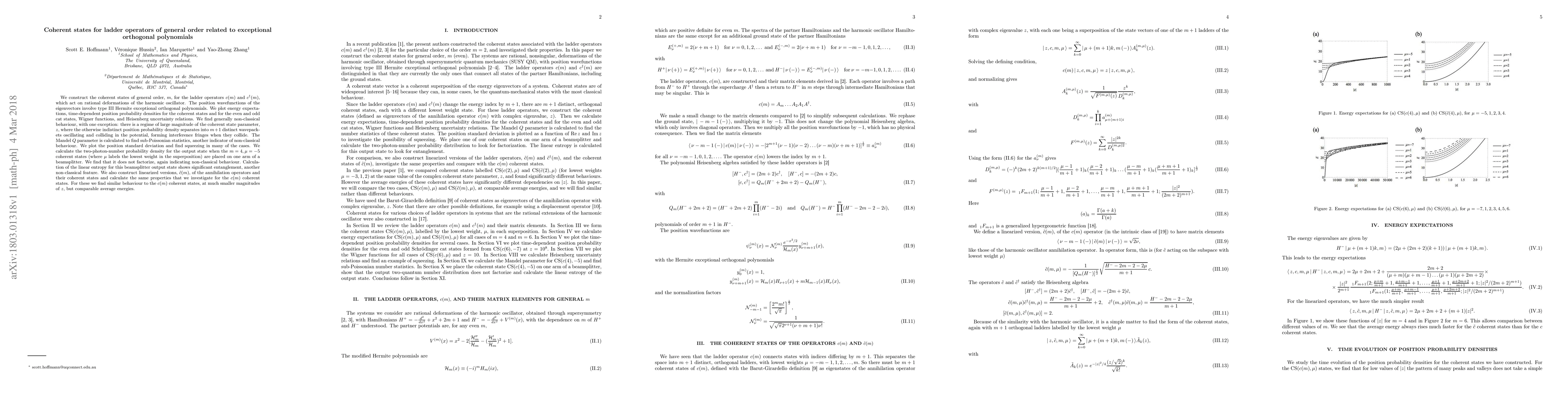 We construct the coherent states of general order, $m$ for the ladder operators, $c(m)$ and $c^\dagger(m)$, which act on rational deformations of the harmonic oscillator. The position wavefunctions of the eigenvectors involve type III Hermite exceptional orthogonal polynomials. We plot energy expectations, time-dependent position probability densities for the coherent states and for the even and odd cat states, Wigner functions, and Heisenberg uncertainty relations. We find generally non-classical behaviour, with one exception: there is a regime of large magnitude of the coherent state parameter, $z$, where the otherwise indistinct position probability density separates into $m+1$ distinct wavepackets oscillating and colliding in the potential, forming interference fringes when they collide. The Mandel $Q$ parameter is calculated to find sub-Poissonian statistics, another indicator of non-classical behaviour. We plot the position standard deviation and find squeezing in many of the cases. We calculate the two-photon-number probability density for the output state when the $m=4$, $\mu=-5$ coherent states (where $\mu$ labels the lowest weight in the superposition) are placed on one arm of a beamsplitter. We find that it does not factorize, again indicating non-classical behaviour. Calculation of the linear entropy for this beamsplitter output state shows significant entanglement, another non-classical feature. We also construct linearized versions, $\tilde c(m)$, of the annihilation operators and their coherent states and calculate the same properties that we investigate for the coherent states. For these we find similar behaviour to the $c(m)$ coherent states, at much smaller magnitudes of $z$, but comparable average energies.
