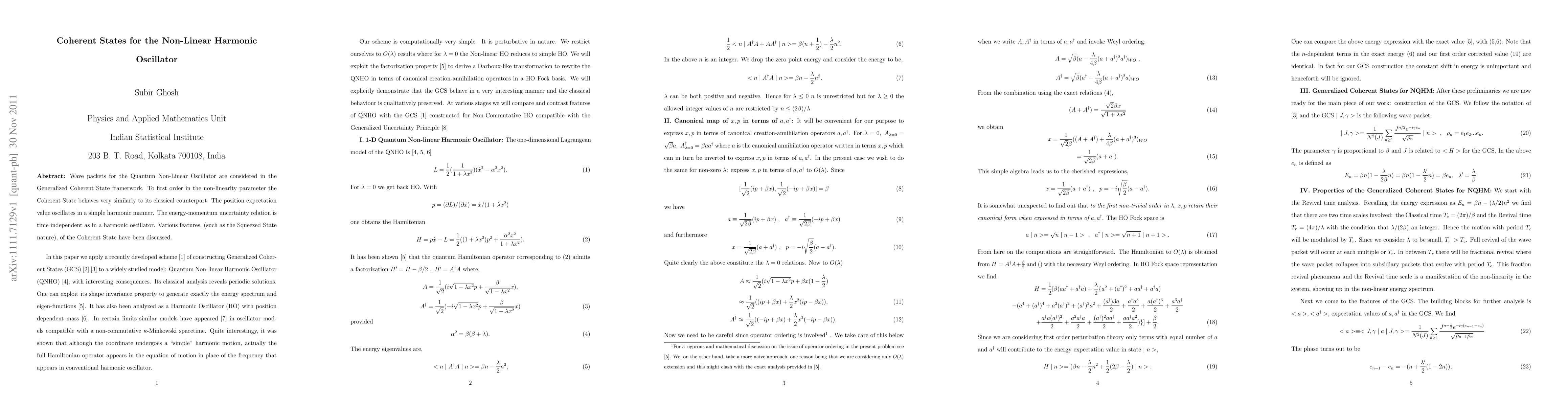 This paper explores wave packets for the Quantum Non-Linear Oscillator within the Generalized Coherent State framework, finding that to first order in the non-linearity parameter, Coherent States behave similarly to their classical counterparts, with harmonic oscillations in the position expectation value and a time-independent energy-momentum uncertainty relation.
